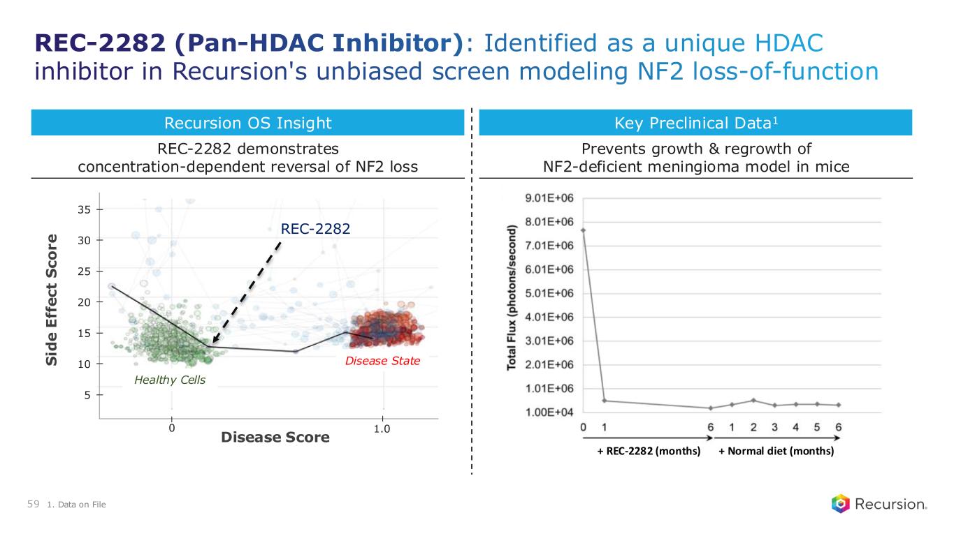 REC-2282 S id e e e eff e c t s c o r e疾病评分01.03025352015105疾病状态健康细胞+ REC-2282(月)+正常饮食(月)复发OS Insight关键临床前数据1 591。File上的数据阻止NF2缺陷型脑膜瘤模型在小鼠中的生长&再生REC-2282证明了NF2损失的浓度依赖性逆转REC-2282(泛HDAC抑制剂):在Recursion的无偏屏幕建模NF2功能损失中被鉴定为独特的HDAC抑制剂