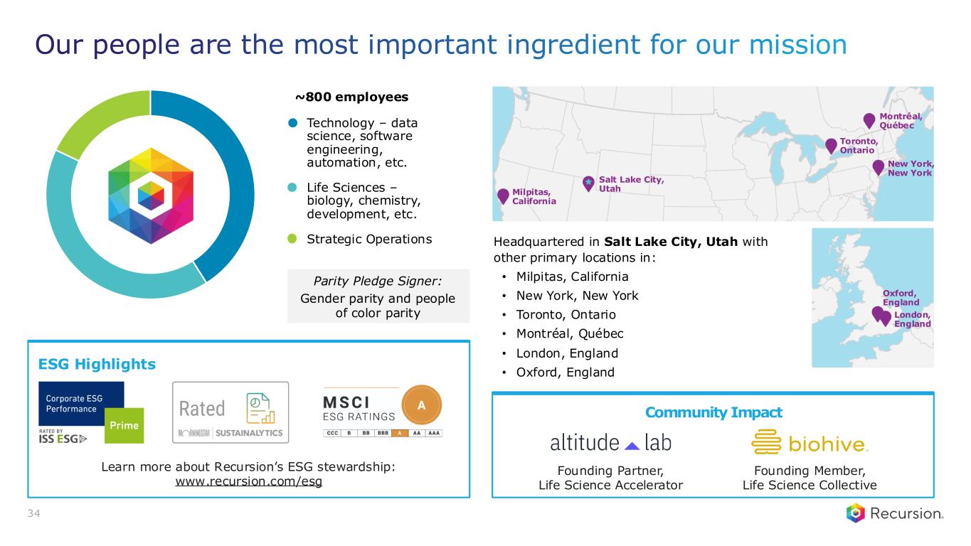 奇偶承诺签署人:性别奇偶和颜色奇偶技术的人–数据科学、软件工程、自动化等生命科学–生物学、化学、发展等。战略运营~800名员工社区影响力创始合伙人、生命科学加速器创始成员、生命科学集体ESG亮点了解有关Recursion的ESG管理的更多信息:www.crecursion.com/esg Milpitas,California Salt Lake City,Utah Toronto,Ontario Montr é al,Qu é bec London,England Oxford,England New York,New York总部位于犹他州盐湖城,其他主要地点位于:•加利福尼亚州米尔皮塔斯•纽约州纽约•安大略省多伦多•魁北克省蒙特雷尔•英国伦敦•英国牛津34我们的员工是我们使命的最重要组成部分