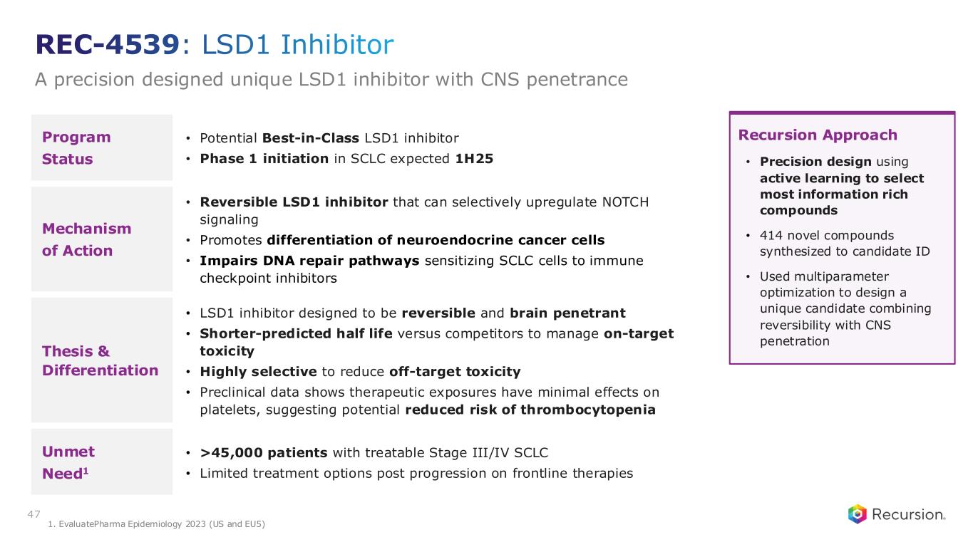 计划状态•潜在的同类最佳LSD1抑制剂• SCLC的1期启动预期1H25作用机制•可选择性上调NOTCH信号的可逆LSD1抑制剂•促进神经内分泌癌细胞的分化•损害DNA修复途径,使SCLC细胞对免疫检查点抑制剂敏感论文&分化• LSD1抑制剂设计为可逆和脑渗透性•与竞争对手相比,预测的半衰期更短,以管理靶向毒性•高度选择性地降低靶向毒性•临床前数据显示,治疗暴露对血小板的影响最小,提示潜在降低的血小板减少风险未满足需求1 • > 45,000名可治疗的III/IV期SCLC患者•一线疗法进展后的治疗选择有限471。EvaluatePharma Epidemiology 2023(US and EU5)Recursion Approach • Precision Design using active learning to select most information-rich compounds • 414 new compounds合成到候选ID • using multi-parameter optimization to design a unique candidate combining reversibility with CNS penetration REC-4539:LSD1 inhibitor一种精密设计的具有CNS penet