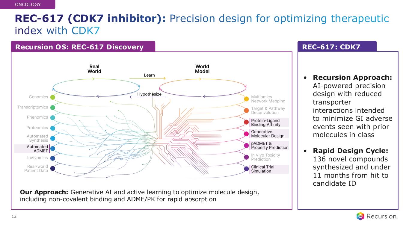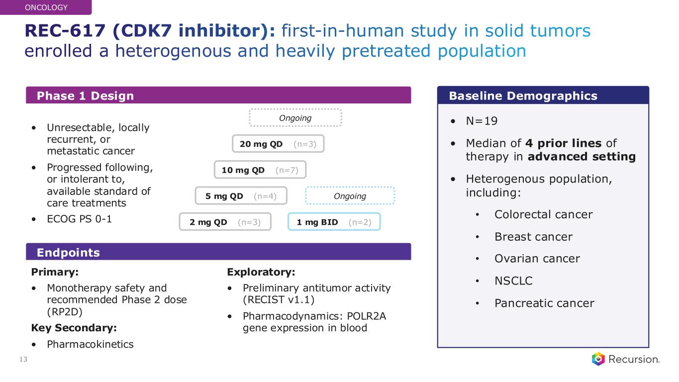 12 REC-617(CDK7抑制剂):CDK7 ONCLOGY Recursion OS优化治疗指数的精密设计:REC-617 Discovery Our approach:generative AI and active learning to optimize molecular design,including非共价结合和用于快速吸收的ADME/PK REC-617:CDK7 • Recursion approach:AI驱动的精密设计,具有减少的转运蛋白相互作用,旨在最大限度地减少与同类中先前分子所见的GI不良事件•快速设计周期:合成136种新化合物,从命中到候选ID不到11个月