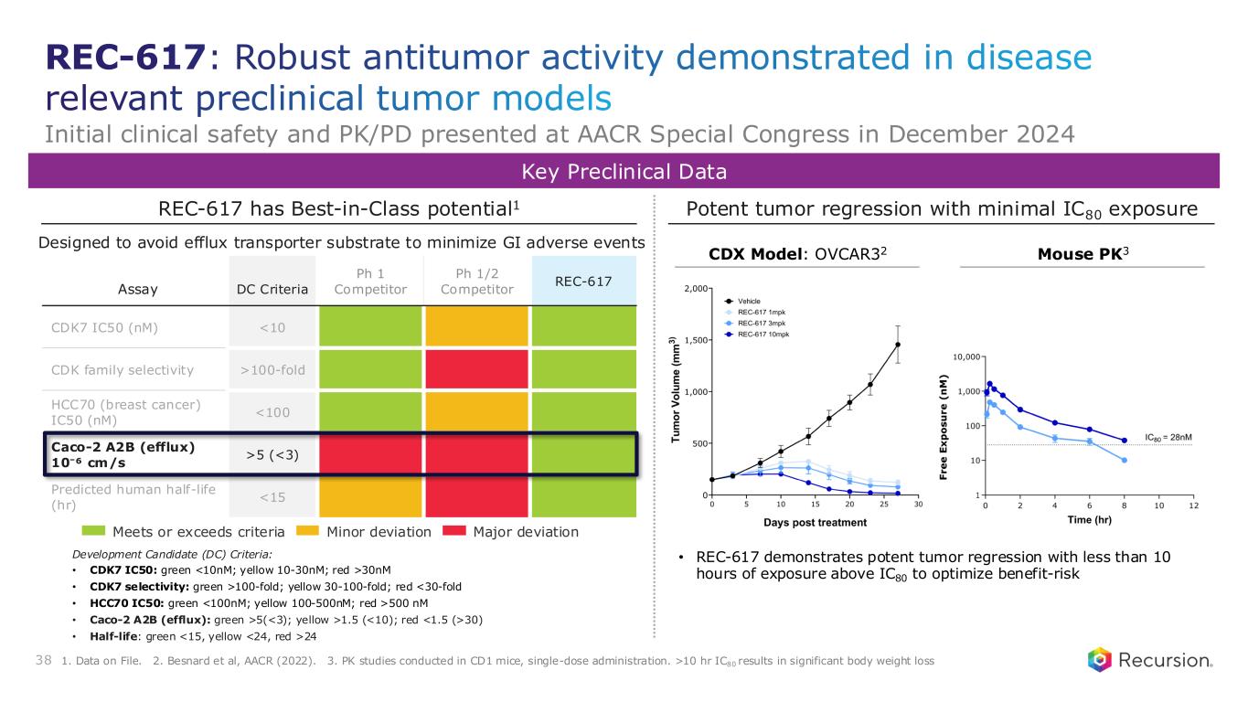 测定DC标准PH1竞争对手PH1/2竞争对手REC-617 CDK7 IC50(nM)< 10 CDK家族选择性> 100倍HCC70(乳腺癌)IC50(nM)< 100 CACO-2 A2B(外排)10 cm/s > 5(< 3)预测的人体半衰期(hr)< 15以最小IC80暴露的有效肿瘤消退REC-617具有同类最佳潜力1,旨在避免外排转运蛋白底物,以最大限度地减少GI不良事件关键临床前数据381。档案上的数据。2.Besnard等,AACR(2022)。3.在CD1小鼠中进行的PK研究,单剂量给药。> 10小时IC80导致显着体重减轻达到或超过标准轻微偏差主要偏差发展候选(DC)标准:• CDK7 IC50:绿色< 10nm;黄色10-30nm;红色> 30nm • CDK7选择性:绿色> 100倍;黄色30-100倍;红色< 30倍• HCC70 IC50:绿色< 100nm;黄色100-500nm;红色> 500 nm • CACO-2 A2B(流出):绿色> 5(< 3);黄色> 1.5(< 10);红色< 1.5(> 30)•半衰期:绿色< 15,黄色< 24,red > 24 • REC-617在IC80以上暴露不到10小时的情况下展示有效的肿瘤消退以优化利益风险CDX模型:OVCAR32小鼠PK3 REC-617:在疾病相关临床前肿瘤模型中展示的强大抗肿瘤活性在2024年12月的AACR特别大会上展示的初步临床安全性和PK/PD