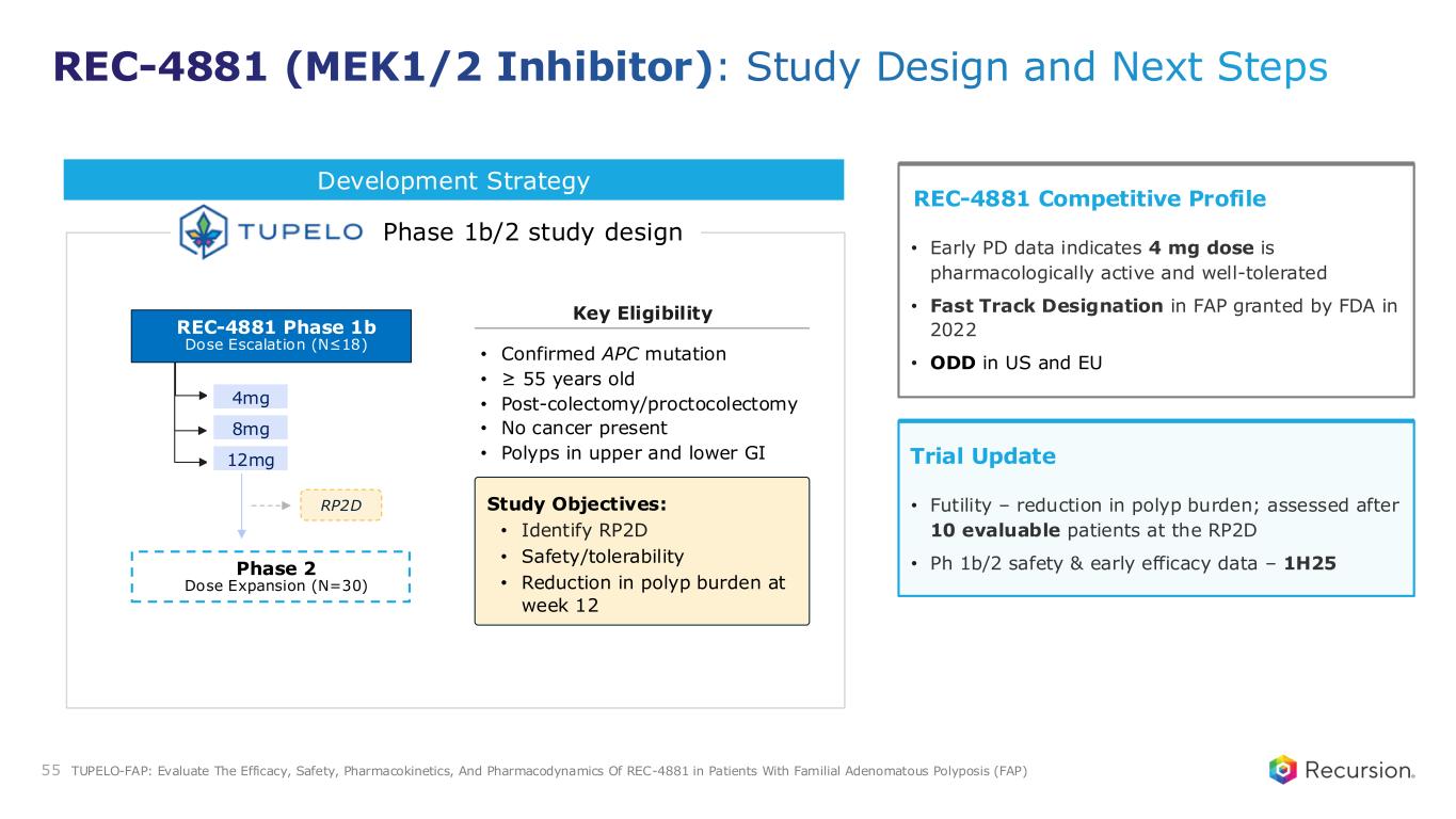 2期剂量扩展(N = 30)REC-4881 1b期剂量递增(N ≤ 18)RPTD •确认APC突变• ≥ 55岁•结肠切除术后/直肠切除术•未出现癌症•上部和下部GI中的息肉4mG8mG12mg研究目标:•确定RPTD •安全性/耐受性•第12周减少息肉负担发展战略1b/2期研究设计55 TUPELO-FAP:评估疗效、安全性、药代动力学,REC-4881在家族性腺瘤性息肉病(FAP)患者中的药效学试验更新•效用–减少息肉负担;在RPTD的10名可评估患者后评估• PH1b/2安全性和早期疗效数据– 1H25 REC-4881竞争概况•早期PD数据表明4 mg剂量具有药理活性且耐受性良好• FDA于2022年授予FAP中的快速通道指定•美国和欧盟关键资格REC-4881(MEK1/2抑制剂)中的ODD:研究设计和后续步骤