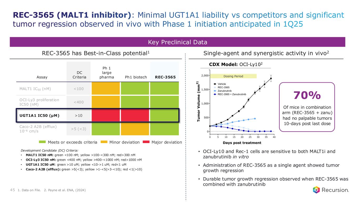 关键临床前数据测定DC标准PH1大型制药公司Ph1 biotech REC-3565MALT1 IC50(nM)< 100OCI-LY3增殖IC50(nM)< 400UGT1A1 IC50(μ M)> 10 CACO-2 A2B(流出)10 cm/s > 5(< 3)REC-3565在vivo2中具有同类最佳的单药潜力1和协同活性• OCI-LY10和Rec-1细胞对MALT1i均敏感和zanubrutinib体外• REC-3565单药给药显示肿瘤生长消退•当REC-3565与zanubrutinib开发候选药物(DC)联合使用时观察到持久的肿瘤生长消退标准:• MALT1 IC50 nm:绿色< 100 nm;黄色> 100-< 300 nm;红色> 300 nm • OCI-LY3 IC50 nm:绿色< 400 nm;黄色> 400-< 1000 nm;红色> 1000 nm • UGT1A1 IC50 uM:绿色> 10 uM;黄色< 10-> 1 uM;红色< 1 uM • CACO-2 A2B(流出):绿色> 5(< 3);黄色> 1-< 5(> 3-< 10);红色< 1(> 10)451档案上的数据。2.Payne等ENA,(2024)达到或超过标准轻微偏差主要偏差CDX模型:OCI-LY102 70%的联合组小鼠(REC-3565 + zanu)在最后一次给药后10天没有可触及的肿瘤REC-3565(MALT1抑制剂):与竞争对手相比最小的UGT1A1责任和在体内观察到的显着肿瘤消退,预计在1Q25开始1期