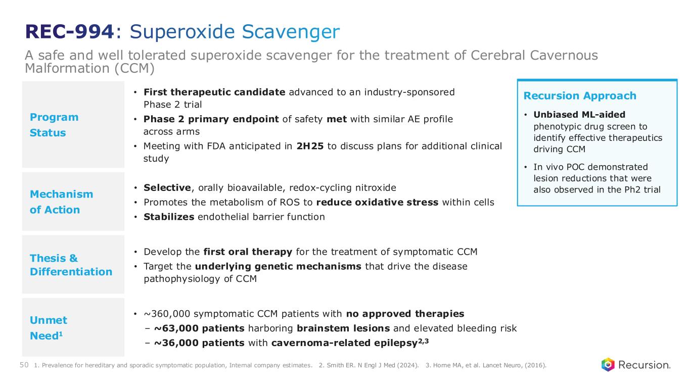 项目状态•首个治疗候选药物进入行业赞助的2期试验• 2期安全性主要终点达到类似的跨组AEE特征•预计将于2H25与FDA会面,讨论额外临床研究的计划作用机制•选择性、口服生物可得,氧化还原循环氮氧化物•促进ROS代谢以减少细胞内的氧化应激•稳定内皮屏障功能论文&分化•开发首个用于治疗症状性CCM的口服疗法•针对驱动CCM未满足需求的疾病病理生理学的潜在遗传机制1 •~360,000名有症状的CCM患者,没有获得批准的疗法–~63,000名伴有脑干病变和出血风险升高的患者–~36,000名海绵瘤相关癫痫患者2,3501。内部公司估计,遗传性和散发症状人群的流行率。2.史密斯ER。N Engl J Med(2024年)。3.Horne MA,et al. Lancet Neuro,(2016)。递归方法•无偏ML辅助的表型药物筛选,以确定驱动CCM的有效疗法•体内POC显示出在Ph2试验REC-994中也观察到的病变减少:超氧化物清除剂一种安全且耐受性良好的超氧化物清除剂,用于治疗脑海绵状畸形(CCM)