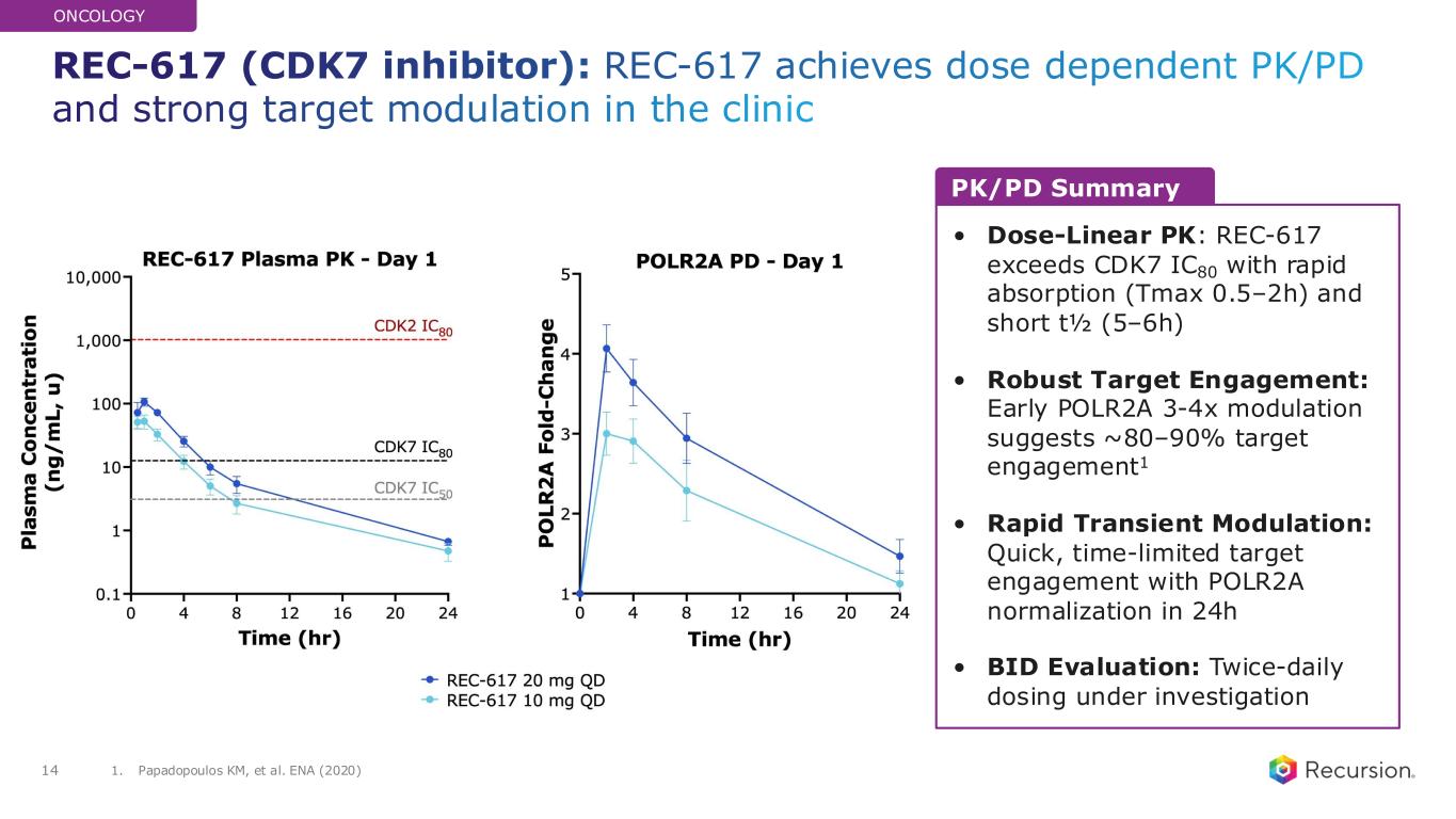 REC-617(CDK7抑制剂):REC-617在临床上实现剂量依赖性PK/PD和强靶点调节141。Papadopoulos KM,et al. ENA(2020)PK/PD摘要•剂量-线性PK:REC-617超过CDK7 IC80,快速吸收(Tmax 0.5 – 2h)和短t ½(5 – 6h)•稳健的目标接合:早期POLR2A 3-4倍调制表明约80 – 90%的目标接合1 •快速瞬态调制:快速、有时间限制的目标接合与POLR2A正常化在24小时• BID评估:正在调查的每日两次给药肿瘤学