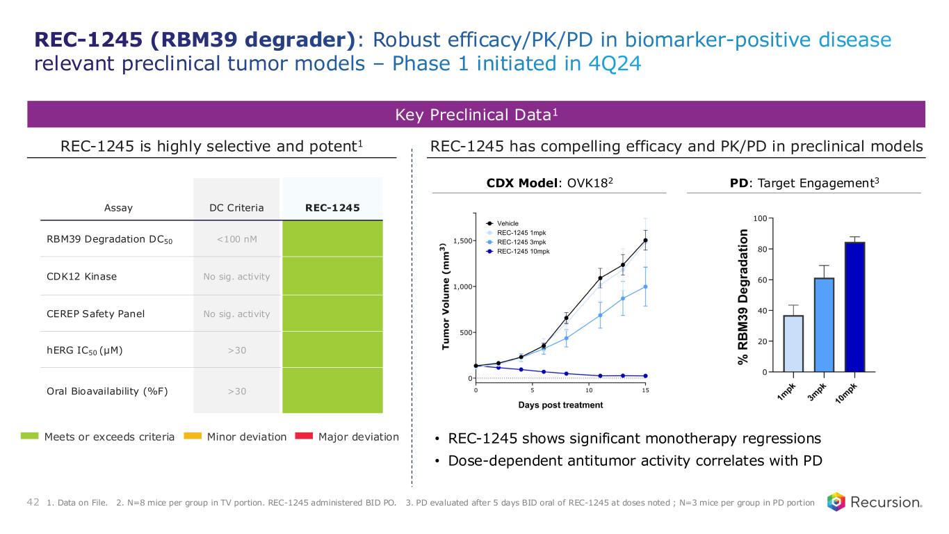 关键临床前数据1 REC-1245具有高度选择性和有效性1测定DC标准REC-1245 RBM39降解DC50 < 100 nM CDK12激酶无sig.活性CEREP安全面板无sig.活性hERG IC50(μ M)> 30口服生物利用度(% F)> 30 REC-1245在临床前模型中具有引人注目的功效和PK/PD 421。档案上的数据。2.TV部分每组N = 8只老鼠。REC-1245给药BID PO。3.REC-1245在注意到的剂量下口服BID 5天后评估PD;PD部分每组N = 3只小鼠达到或超过标准微小偏差主要偏差• REC-1245显示显着的单药治疗退行•剂量依赖性抗肿瘤活性与PD CDX模型相关:OVK182 PD:靶点Engagement3 REC-1245(RBM39降解剂):在生物标志物阳性疾病相关临床前肿瘤模型中的强大效率/PK/PD – 1期启动于4Q24