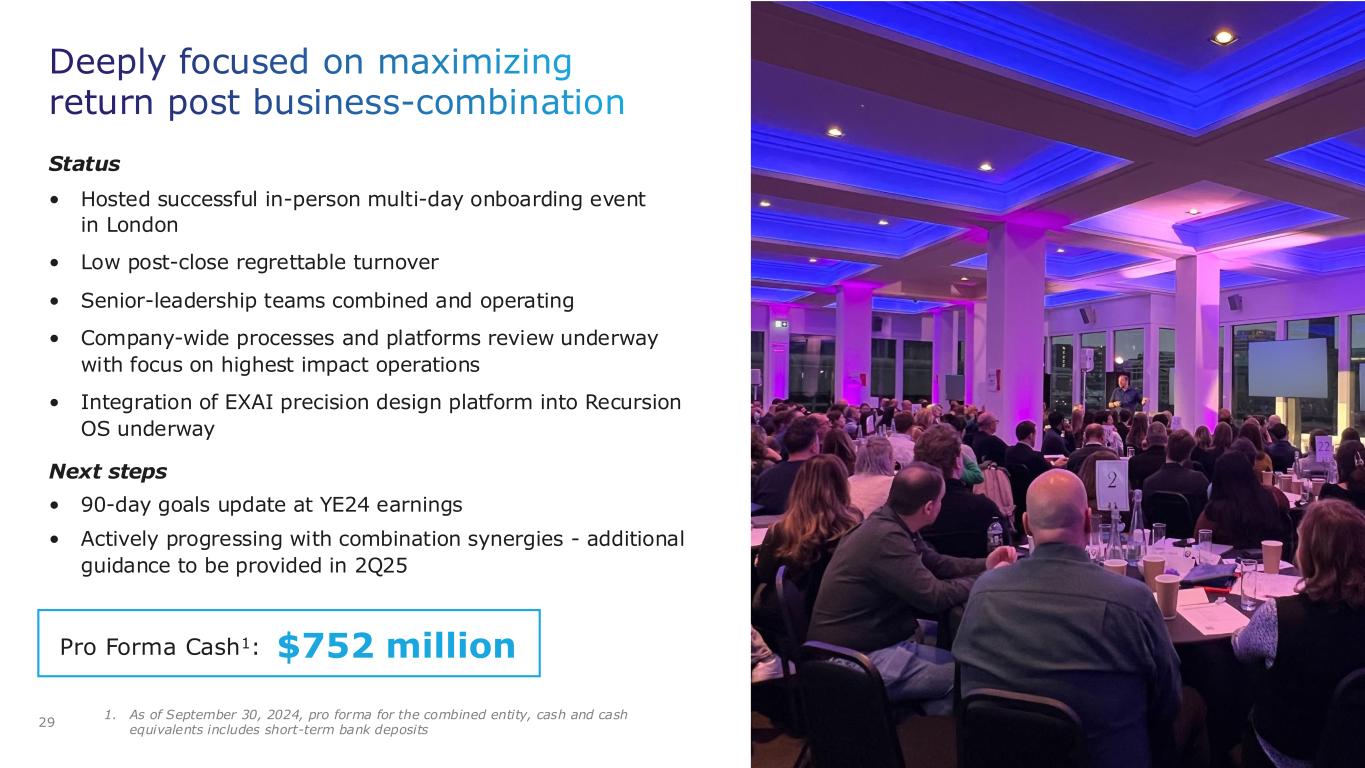 深度聚焦最大化回报后业务组合291。截至2024年9月30日,合并后实体的备考现金和现金等价物包括短期银行存款状态•在伦敦成功举办了多天的面对面入职活动•交易结束后令人遗憾的低更替率•高级领导团队合并并运营•公司范围内的流程和平台审查正在进行中,重点是最具影响力的运营•正在进行将EXAI精密设计平台整合到递归OS的后续步骤•在YE24收益时更新90天目标•积极推进合并协同效应-将在2Q25提供额外指导备考现金1:7.52亿美元