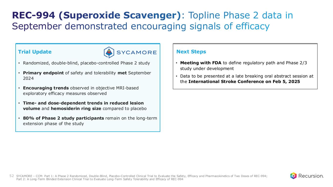 52项试验更新•随机、双盲、安慰剂对照的2期研究•安全性和耐受性的主要终点于2024年9月达到•在观察到的基于MRI的客观探索性疗效测量中观察到令人鼓舞的趋势•与安慰剂相比,病灶体积和含铁血黄素环大小减少的时间和剂量依赖性趋势• 80%的2期研究参与者仍处于研究的长期扩展阶段下一步•与FDA会面,以确定监管路径和正在开发的2/3期研究•数据将在2月5日国际卒中大会的一次较晚的口头摘要会议上公布,2025 SYCAMORE – CCM:第1部分:评估两种剂量REC-994的安全性、有效性和药代动力学的2期随机、双盲、安慰剂对照临床试验;第2部分:评估REC-994 REC-994(超氧化物清除剂)长期安全耐受性和有效性的长期盲延临床试验:9月份的顶线2期数据显示出令人鼓舞的疗效信号