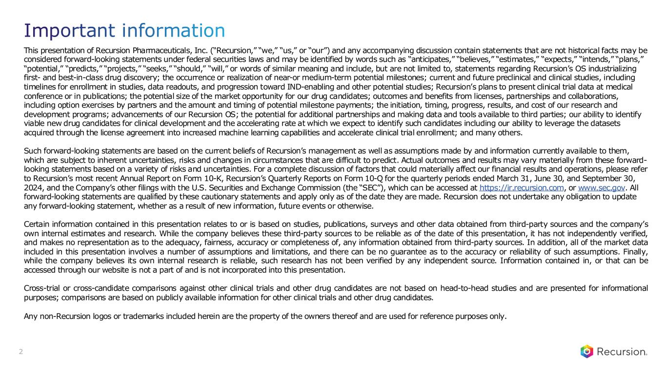 Recursion Pharmaceuticals, Inc.(“Recursion”、“我们”、“我们”或“我们的”)的此演示文稿以及任何随附的讨论包含的非历史事实的陈述可能被视为联邦证券法下的前瞻性陈述,可以通过“预期”、“相信”、“估计”、“预期”、“打算”、“计划”、“潜在”、“预测”、“项目”、“寻求”、“应该”、“将”等词语来识别,或具有类似含义的词语,包括但不限于有关Recursion的OS产业化第一类和同类最佳药物发现的声明;近期或中期潜在里程碑的发生或实现;当前和未来的临床前和临床研究,包括研究注册的时间表、数据读出以及向IND授权和其他潜在研究的进展;Recursion在医学会议或出版物上展示临床试验数据的计划;我们候选药物的市场机会的潜在规模;许可、伙伴关系和合作的结果和收益,包括合作伙伴行使选择权以及潜在里程碑付款的金额和时间;我们研发项目的启动、时间安排、进展、结果和成本;我们递归OS的进步;建立更多合作伙伴关系以及向第三方提供数据和工具的潜力;我们为临床开发确定可行的新候选药物的能力以及我们期望确定此类候选药物的加速速度,包括我们利用通过许可协议获得的数据集增强机器学习能力和加速临床试验注册的能力;以及许多其他方面。此类前瞻性陈述基于Recursion管理层当前的信念以及他们做出的假设和目前可获得的信息,这些假设受到难以预测的内在不确定性、风险和环境变化的影响。基于各种风险和不确定性,实际结果和结果可能与这些前瞻性陈述存在重大差异。有关可能对我们的财务业绩和运营产生重大影响的因素的完整讨论,请参阅Recursion最近的10-K表格年度报告、Recursion截至2024年3月31日、6月30日和9月30日的季度期间的10-Q表格季度报告,以及该公司向美国证券交易委员会(“SEC”)提交的其他文件,可在https://ir.creursion.com或www.sec.gov上查阅。所有前瞻性陈述均受这些警示性陈述的限制,并且仅适用于作出这些陈述之日。Recursion不承担更新任何前瞻性陈述的任何义务,无论是由于新信息、未来事件或其他原因。本演示文稿中包含的某些信息涉及或基于从第三方来源获得的研究、出版物、调查和其他数据以及公司自己的内部估计和研究。虽然公司相信这些第三方来源在本介绍之日是可靠的,但它没有独立核实,也不对从第三方来源获得的任何信息的充分性、公平性、准确性或完整性作出任何陈述。此外,本演示文稿中包含的所有市场数据均涉及多项假设和限制,无法保证此类假设的准确性或可靠性。最后,虽然该公司认为自己的内部研究是可靠的,但此类研究并未得到任何独立来源的验证。所包含的信息,或可通过我们的网站访问的信息不是本演示文稿的一部分,也不包含在本演示文稿中。与其他临床试验和其他候选药物的跨试验或跨候选药物比较不是基于头对头研究,而是为了提供信息目的而提出;比较是基于其他临床试验和其他候选药物的公开信息。此处包含的任何非递归徽标或商标均为其所有者的财产,仅用于参考目的。2重要信息
