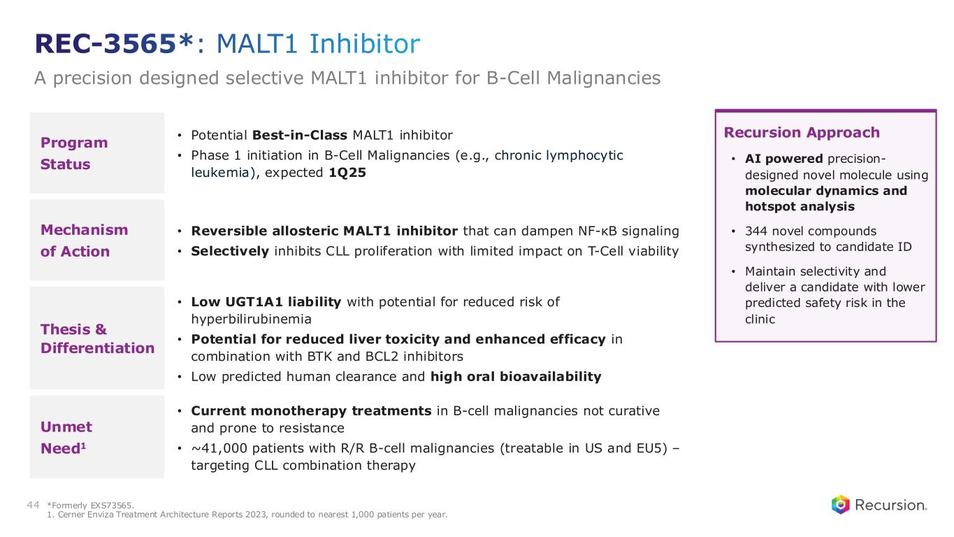 项目状态•潜在的同类最佳MALT1抑制剂• B细胞恶性肿瘤(例如慢性淋巴细胞白血病)的1期启动,预计1Q25作用机制•可逆变构MALT1抑制剂可抑制NF-β B信号传导•选择性抑制CLL增殖,对T细胞活力影响有限论文&分化• UGT1A1低易感性,有可能降低高胆红素血症风险•与BTK和BCL2抑制剂联合使用可能降低肝毒性并提高疗效•预测的低人体清除率和高口服生物利用度未满足的需求1 •目前B细胞恶性肿瘤的单一疗法治疗没有疗效且容易产生耐药性•约41,000名R/R B细胞恶性肿瘤患者(可在美国和EU5治疗)–靶向CLL联合疗法44*前身为EXS73565。1.Cerner Enviza治疗架构报告2023年,每年四舍五入到最接近的1000名患者。递归方法• AI驱动的使用分子动力学和热点分析精确设计的新分子• 344种新化合物合成到候选ID •保持选择性并在临床中交付预测安全风险较低的候选REC-3565*:MALT1抑制剂一种精准设计的B细胞恶性肿瘤选择性MALT1抑制剂