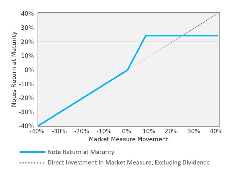 这项投资适用于那些预计市场指数在债券期限内会适度上涨的投资者。这些投资者愿意接受有限的回报水平,承担全部的风险,并放弃中期利息支付。 |