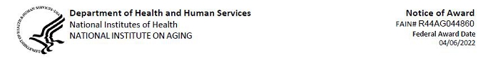 该奖项被授予联邦奖项识别号(FAIN)R44AG044860。受赠方必须在根据本裁决颁发的每个财团/子裁决上记录指定的FAIN。