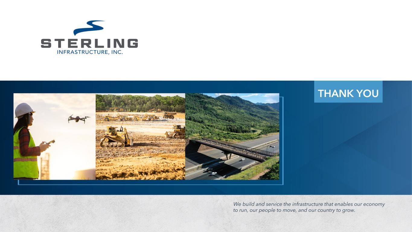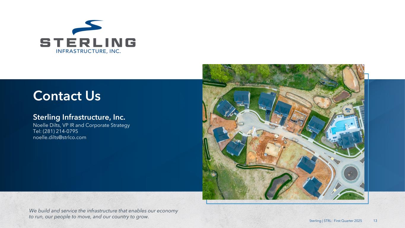 我们建设和服务的基础设施,使我们的经济能够运行,我们的人民能够流动,我们的国家能够增长。Sterling | STRL:2025年第一季度13联系我们Sterling Infrastructure, Inc. Noelle Dilts,IR和企业战略副总裁电话:(281)214-0795 noelle.dilts@strlco.com