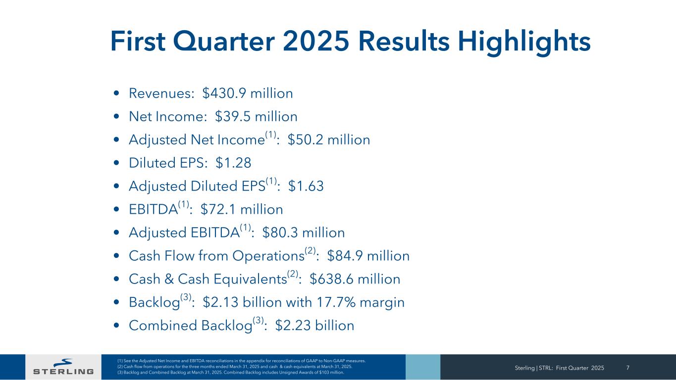 + 2025年第一季度业绩Sterling | STRL:2025年第一季度6