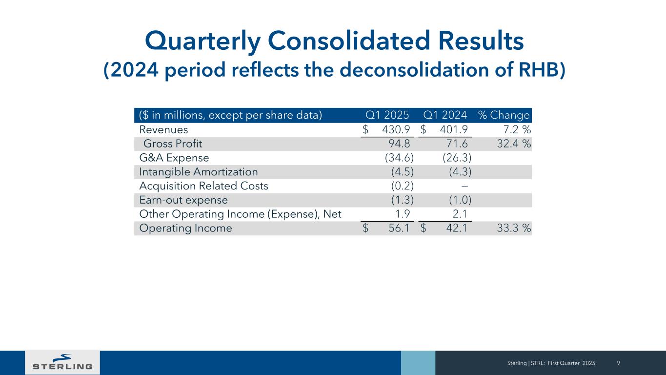 Sterling | STRL:2025年第一季度9个季度合并业绩(2024年期间反映了RHB的分拆)(百万美元,每股数据除外)2025年第一季度2024年第一季度%变化收入430.9美元401.97.2%毛利润94.87 1.63 2.4% G & A费用(34.6)(26.3)无形资产摊销(4.5)(4.3)收购相关成本(0.2)—盈利费用(1.3)(1.0)其他营业收入(费用)净额1.9 2.1营业收入$ 56.1 $ 42.13 3.3%