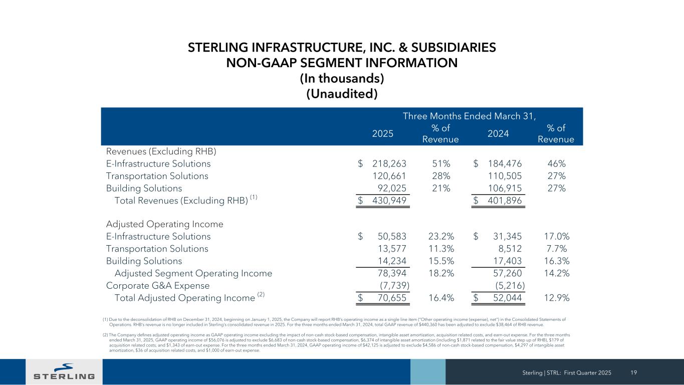 Sterling | STRL:2025年第一季度19截至3月31日的三个月,占营收2024%营收营收(不含RHB)E-Infrastructure Solutions $ 218,26351% $ 184,47646% Transportation Solutions 120,66128% 110,50527% Building Solutions 92,02521% 106,91527%总收入(不含RHB)(1)$ 430,949 $ 401,896调整后营业收入E-Infrastructure Solutions $ 50,58323.2% $ 31,34517.0% Transportation Solutions 13,57711.3% 8,5127.7% Building Solutions 14,23415.5% 17,40316.3%调整后分部营业收入78,39418.2% 57,26014.2%公司G & A费用(7,739)(5,216)调整后营业收入总额(2)$自2025年1月1日起,公司将在合并经营报表中将兴业银行的营业收入作为单行项目(“其他营业收入(费用),净额”)列报。2025年,RHB的收入不再计入Sterling的合并收入。截至2024年3月31日的三个月,GAAP总收入为440,360美元,已调整为不包括RHB38,464美元的收入。(2)公司将调整后营业收入定义为剔除非现金股票薪酬、无形资产摊销、收购相关成本和盈利费用影响的GAAP营业收入。截至2025年3月31日的三个月,GAAP营业收入56076美元经调整后不包括6683美元的非现金股票薪酬、6374美元的无形资产摊销(包括与RHB公允价值提升相关的1871美元)、179美元的收购相关成本和1343美元的盈利支出。截至2024年3月31日的三个月,GAAP营业收入42125美元经调整后不包括4586美元的非现金股票薪酬、4297美元的无形资产摊销、36美元的收购相关成本以及1000美元的盈利费用。Sterling Infrastructure,INC. & Subsidiaries NON-GAAP Segment Information(in thousands)(unaudited)