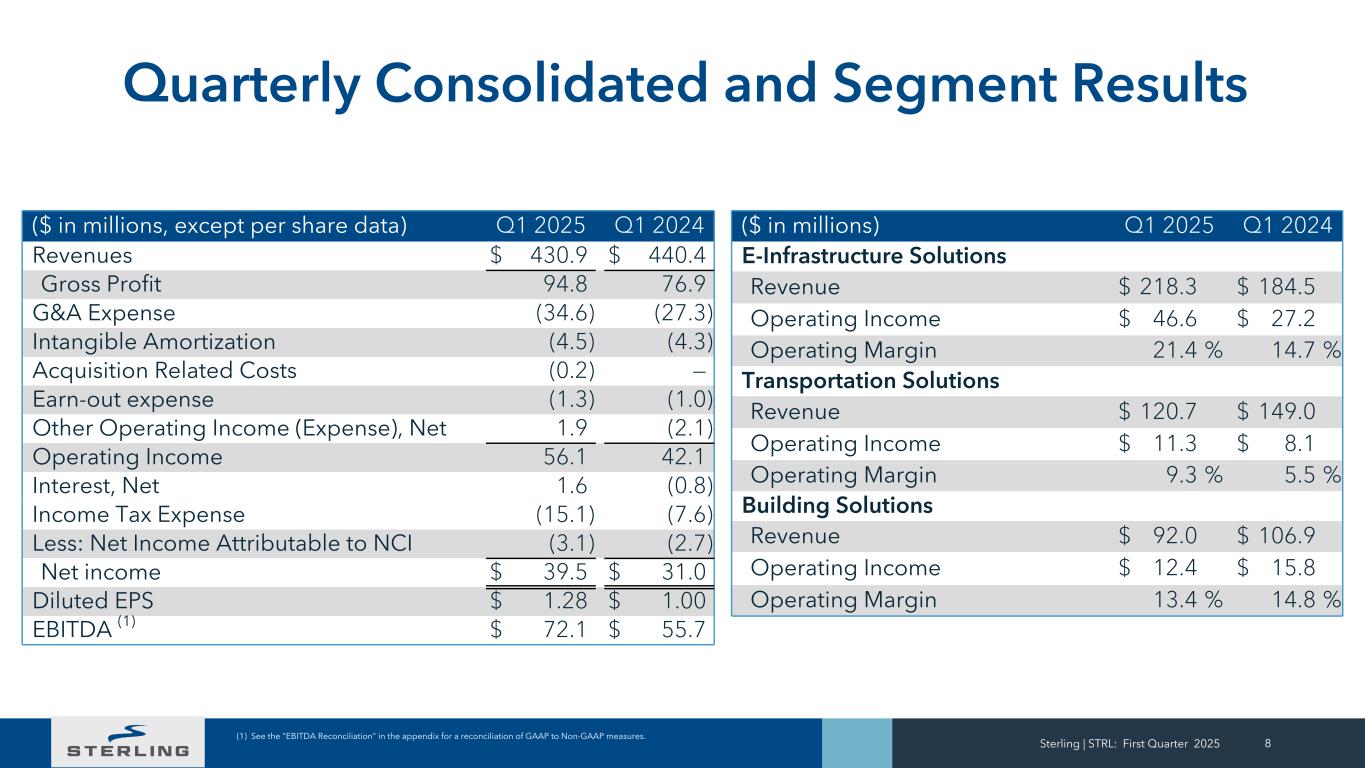 Sterling | STRL:2025年第一季度8季度合并和分部业绩(百万美元,每股数据除外)2025年第一季度2024年第一季度收入430.9美元440.4美元毛利润94.876.9 G & A费用(34.6)(27.3)无形资产摊销(4.5)(4.3)收购相关成本(0.2)—盈利费用(1.3)(1.0)其他营业收入(费用),净额1.9(2.1)营业收入56.14 2.1利息,净额1.6(0.8)所得税费用(15.1)(7.6)减:归属于NCI的净利润(3.1)(2.7)净收入$ 39.5 $ 31.0摊薄后每股收益$ 1.28 $ 1.00 EBITDA(1)$ 72.1 $ 55.7(百万美元)2025年第一季度2024年第一季度电子基础设施解决方案收入$ 218.3 $ 184.5营业收入$ 46.6 $ 27.2营业利润率21.4% 14.7%运输解决方案收入$ 120.7 $ 149.0营业收入$ 11.3 $ 8.1营业利润率9.3% 5.5%建筑解决方案收入$ 92.0 $ 106.9营业收入$ 12.4 $ 15.8营业利润率13.4% 14.8%(1)见GAAP与非GAAP措施对账附录中的“EBITDA对账”。
