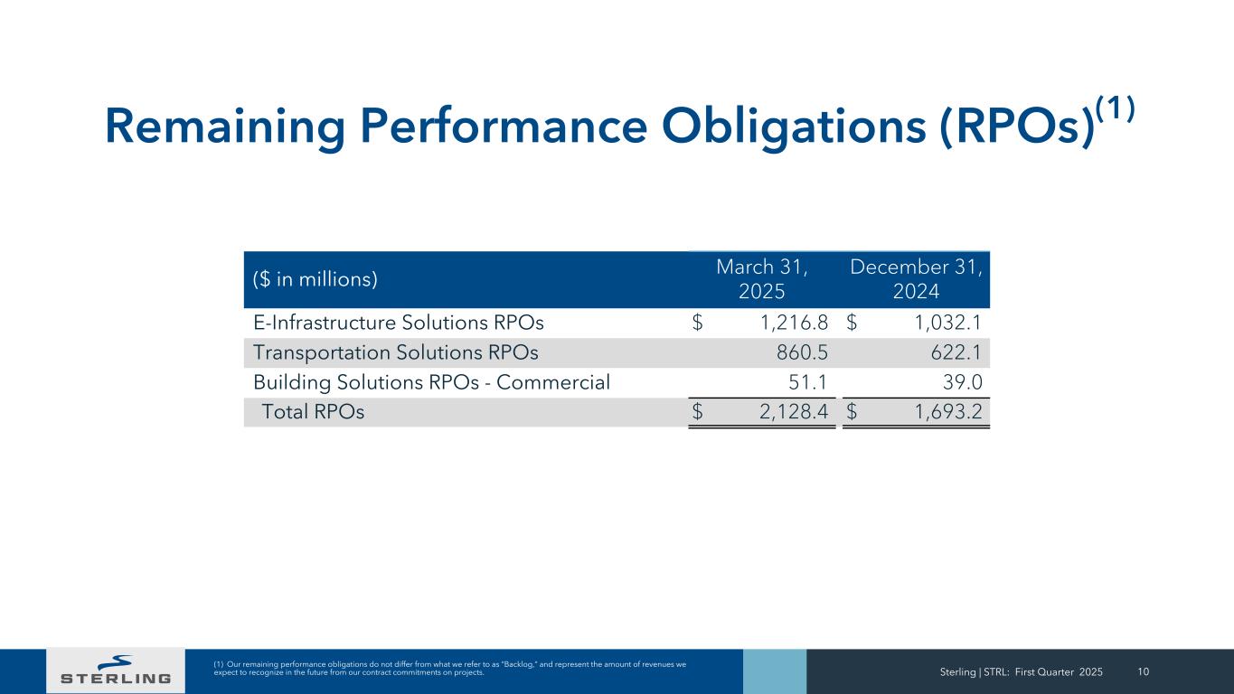 Sterling | STRL:2025年第一季度10项剩余履约义务(RPOs)(1)(百万美元)2025年3月31日2024年12月31日电子基础设施解决方案RPOs 1,216.8美元1,032.1美元运输解决方案RPOs 86 0.56 22.1建筑解决方案RPOs-商业51.13 9.0总RPOs 2,128.4美元1,693.2美元(1)我们剩余的履约义务与我们所说的“积压”没有区别,代表我们预计未来将从我们对项目的合同承诺中确认的收入金额。