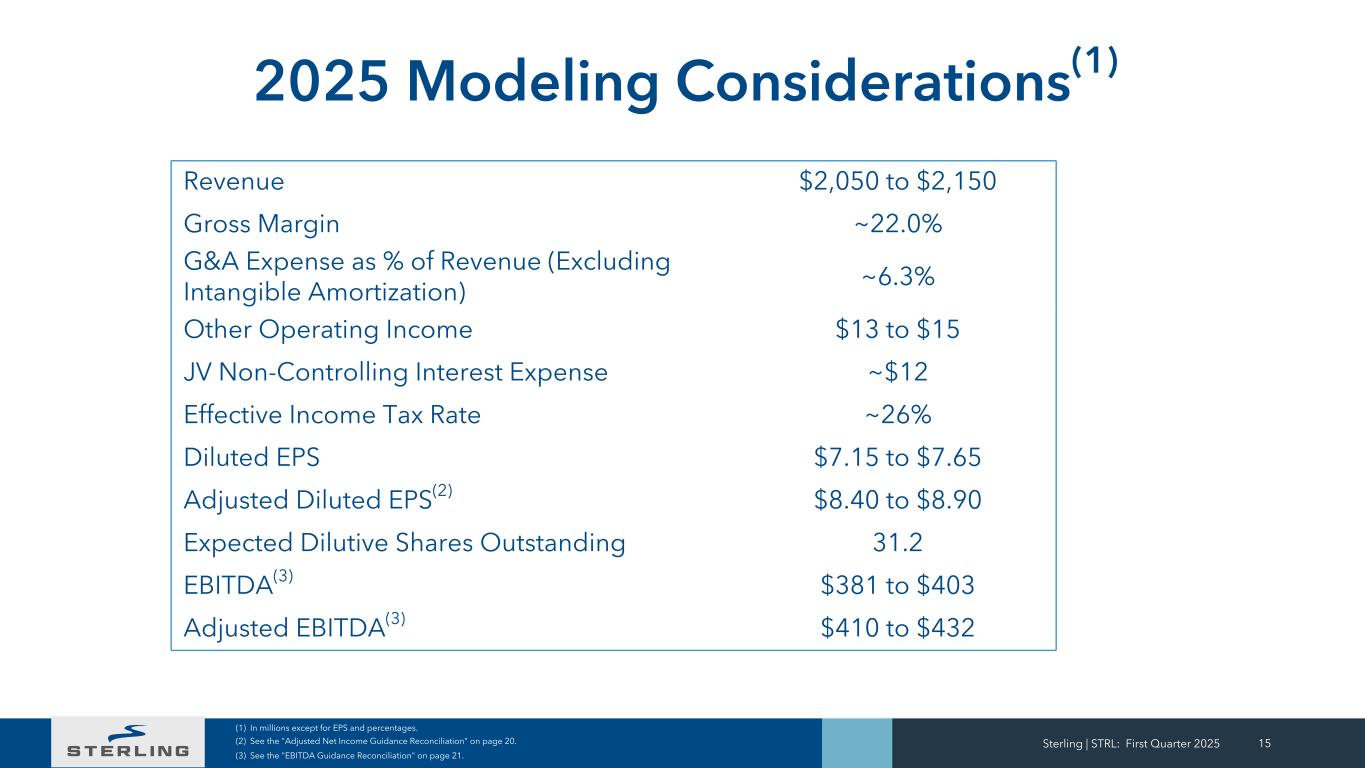 Sterling | STRL:2025年第一季度152025年建模考虑因素(1)(1)以百万计,EPS和百分比除外。(2)见第20页“调整后净收入指引调节”。(3)见第21页“EBITDA指引调节”。收入$ 2,050至$ 2,150毛利率~22.0% G & A费用占收入的百分比(不包括无形摊销)~6.3%其他营业收入$ 13至$ 15合资公司非控股利息费用~$ 12有效所得税率~26%稀释后每股收益$ 7.15至$ 7.65调整后稀释后每股收益(2)$ 8.40至$ 8.90预期已发行摊薄股31.2 EBITDA(3)$ 381至$ 403调整后EBITDA(3)$ 410至$ 432