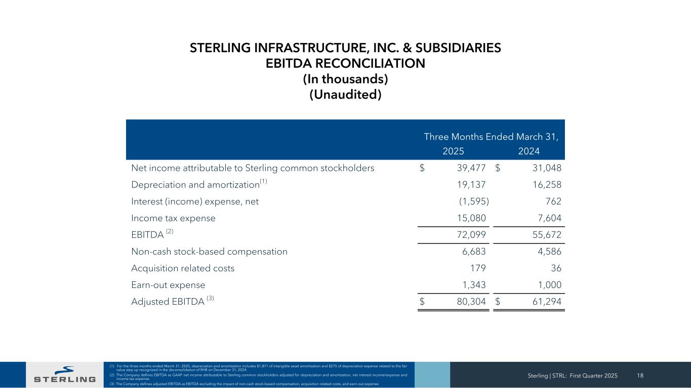 (1)截至2025年3月31日的三个月,折旧和摊销包括1871美元的无形资产摊销和275美元的折旧费用,这些费用与在2024年12月31日取消合并RHB时确认的公允价值提升有关。(2)公司将EBITDA定义为经折旧和摊销、净利息收入/费用和所得税费用调整后的GAAP归属于Sterling普通股股东的净利润。(3)公司将调整后EBITDA定义为不包括非现金股票薪酬、收购相关成本和盈利费用影响的EBITDA。Sterling | STRL:2025年第一季度18截至2025年3月31日的三个月2024年归属于Sterling普通股股东的净利润39,477美元31,048美元折旧和摊销(1)19,13716,258利息(收入)费用,净额(1,595)762所得税费用15,0807,604 EBITDA(2)72,09955,672非现金股票补偿6,6834,586收购相关成本17936盈利费用1,3431,000调整后EBITDA(3)80,304美元61,294美元Sterling Infrastructure,INC. & Subsidiaries EBITDA对账(单位:千)(未经审计)
