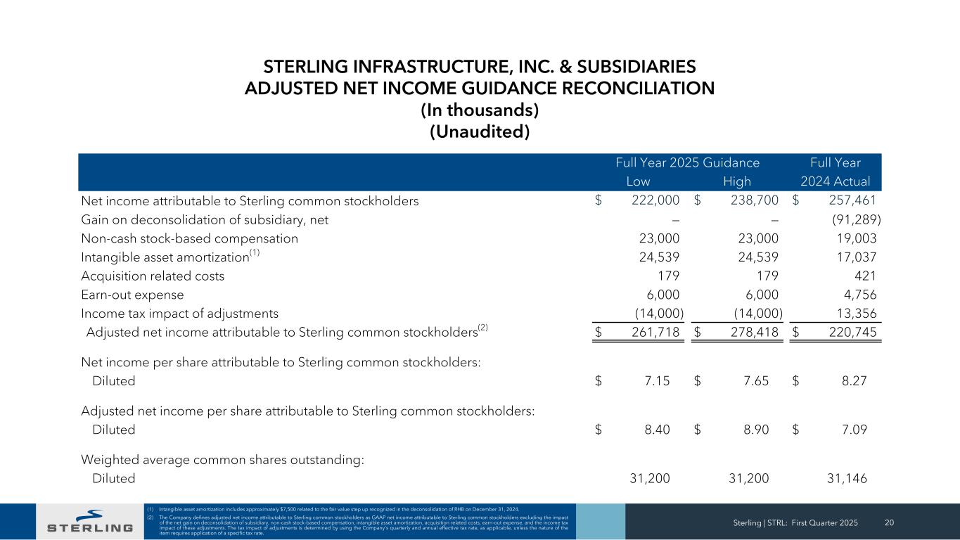 Sterling | STRL:2025年第一季度20(1)无形资产摊销包括与RHB2024年12月31日拆分中确认的公允价值提升相关的约7,500美元。(2)公司将调整后归属于Sterling普通股股东的净利润定义为GAAP归属于Sterling普通股股东的净利润,不包括分拆子公司的净收益、非现金股票补偿、无形资产摊销、收购相关成本、盈利费用以及这些调整的所得税影响。调整的税务影响是通过使用公司的季度和年度有效税率(如适用)确定的,除非项目的性质要求应用特定税率。2025年全年指引全年低点2024年实际归属于英镑普通股股东的净利润222,000美元238,700美元257,461美元分拆子公司收益,净额——(91,289)非现金股票补偿23,00023,00019,003无形资产摊销(1)24,53924,53917,037收购相关成本179179421盈利费用6,0006,0004,756调整的所得税影响(14,000)(14,000)13,356调整后归属于Sterling普通股股东的净利润(2)261,718美元278,418美元220,745美元归属于Sterling普通股股东的每股净利润:稀释后7.15美元7.65美元8.27调整后归属于Sterling普通股股东的每股净利润:稀释后8.40美元8.90美元7.09加权平均已发行普通股:稀释后31,20031,20031,146英镑基础设施,INC. & Subsidiaries调整后净收入指引对账(单位:千)(未经审计)