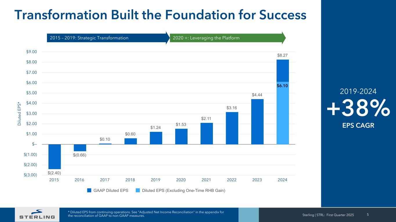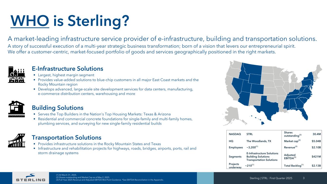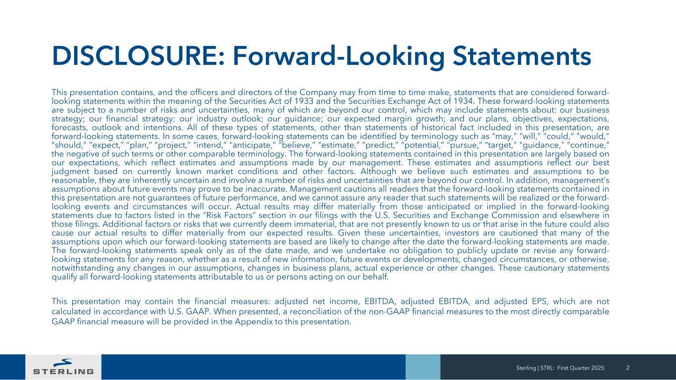 2 Sterling | STRL:2025年第一季度披露:前瞻性陈述本演示文稿包含且公司高级职员和董事可能会不时做出的陈述被视为1933年《证券法》和1934年《证券交易法》含义内的前瞻性陈述。这些前瞻性陈述受到许多风险和不确定性的影响,其中许多超出了我们的控制范围,其中可能包括有关以下方面的陈述:我们的业务战略;我们的财务战略;我们的行业前景;我们的指导;我们的预期利润率增长;以及我们的计划、目标、预期、预测、前景和意图。除本演示文稿中包含的历史事实陈述外,所有这些类型的陈述均为前瞻性陈述。在某些情况下,前瞻性陈述可以通过“可能”、“将”、“可能”、“将”、“应该”、“预期”、“计划”、“项目”、“打算”、“预期”、“相信”、“估计”、“预测”、“潜在”、“追求”、“目标”、“指导”、“继续”等术语或其他类似术语的否定词来识别。本演示文稿中包含的前瞻性陈述主要基于我们的预期,这些预期反映了我们管理层做出的估计和假设。这些估计和假设反映了我们基于当前已知市场状况和其他因素的最佳判断。尽管我们认为这些估计和假设是合理的,但它们本质上是不确定的,并且涉及我们无法控制的许多风险和不确定性。此外,管理层对未来事件的假设可能被证明是不准确的。管理层提醒所有读者,本演示文稿中包含的前瞻性陈述并非对未来业绩的保证,我们无法向任何读者保证此类陈述将会实现或前瞻性事件和情况将会发生。由于我们向美国证券交易委员会提交的文件中的“风险因素”部分以及这些文件的其他部分中列出的因素,实际结果可能与前瞻性陈述中预期或暗示的结果存在重大差异。我们目前认为不重要、我们目前不知道或未来出现的其他因素或风险也可能导致我们的实际结果与我们的预期结果存在重大差异。鉴于这些不确定性,请投资者注意,我们的前瞻性陈述所依据的许多假设可能会在做出前瞻性陈述之日之后发生变化。前瞻性陈述仅在作出之日起生效,我们不承担以任何理由公开更新或修改任何前瞻性陈述的义务,无论是由于新信息、未来事件或发展、变化的情况或其他原因,尽管我们的假设有任何变化、业务计划有变化、实际经验或其他变化。这些警示性声明限定了可归属于我们或代表我们行事的人的所有前瞻性声明。这份演示文稿可能包含以下财务指标:调整后的净收入、EBITDA、调整后的EBITDA和调整后的每股收益,这些不是按照美国公认会计原则计算的。在介绍时,将在本介绍的附录中提供非GAAP财务指标与最直接可比的GAAP财务指标的对账。
