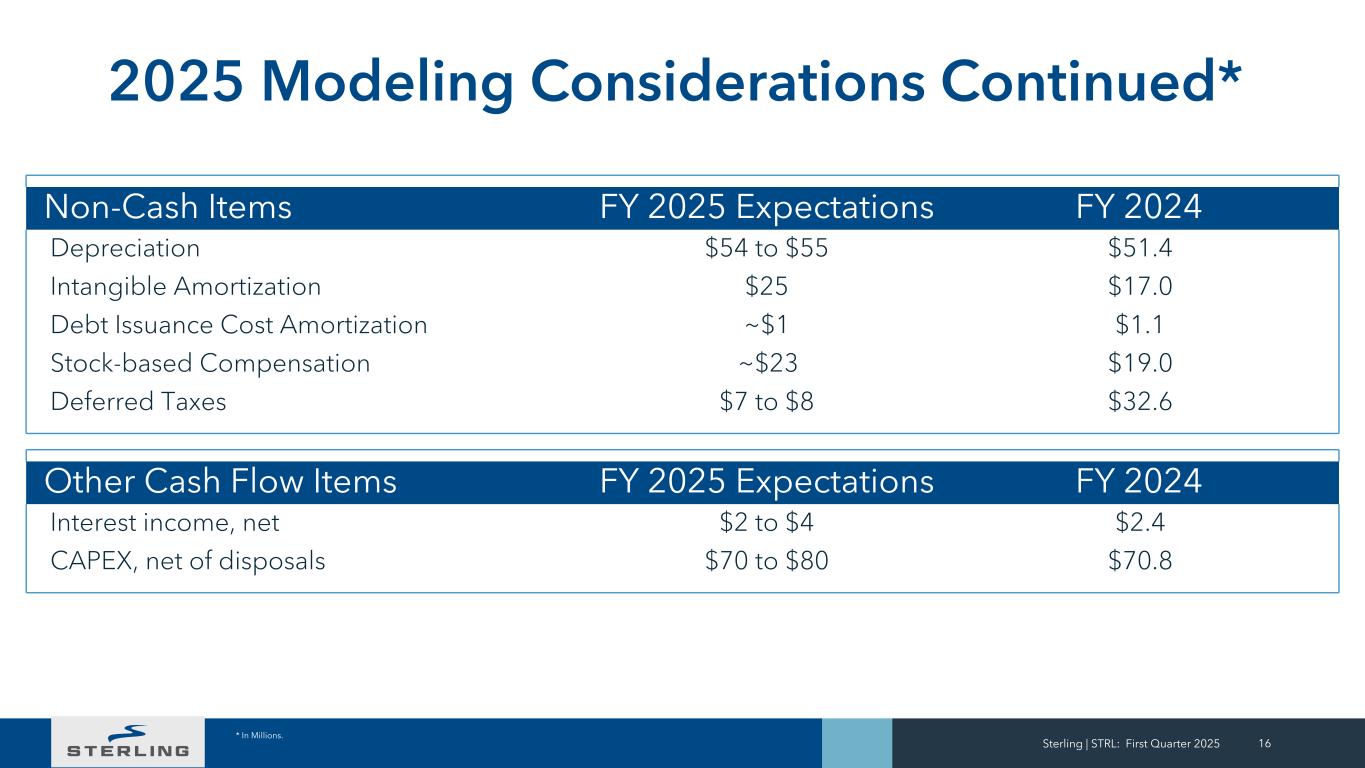 2025年建模考虑(续)*Sterling | STRL:2025年第一季度16*以百万计。非现金项目2025财年预期2024财年折旧54美元至55美元51.4美元无形摊销25美元17.0美元债务发行成本摊销~1美元1.1美元股票补偿~23美元19.0美元递延税款7美元至8美元32.6美元其他现金流项目2025财年预期2024财年利息收入,净额2美元至4美元2.4美元资本支出,扣除处置费用70美元至80美元70.8美元
