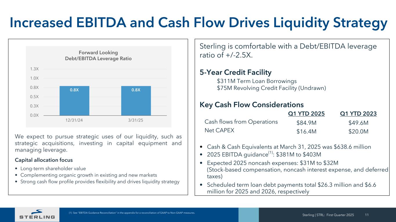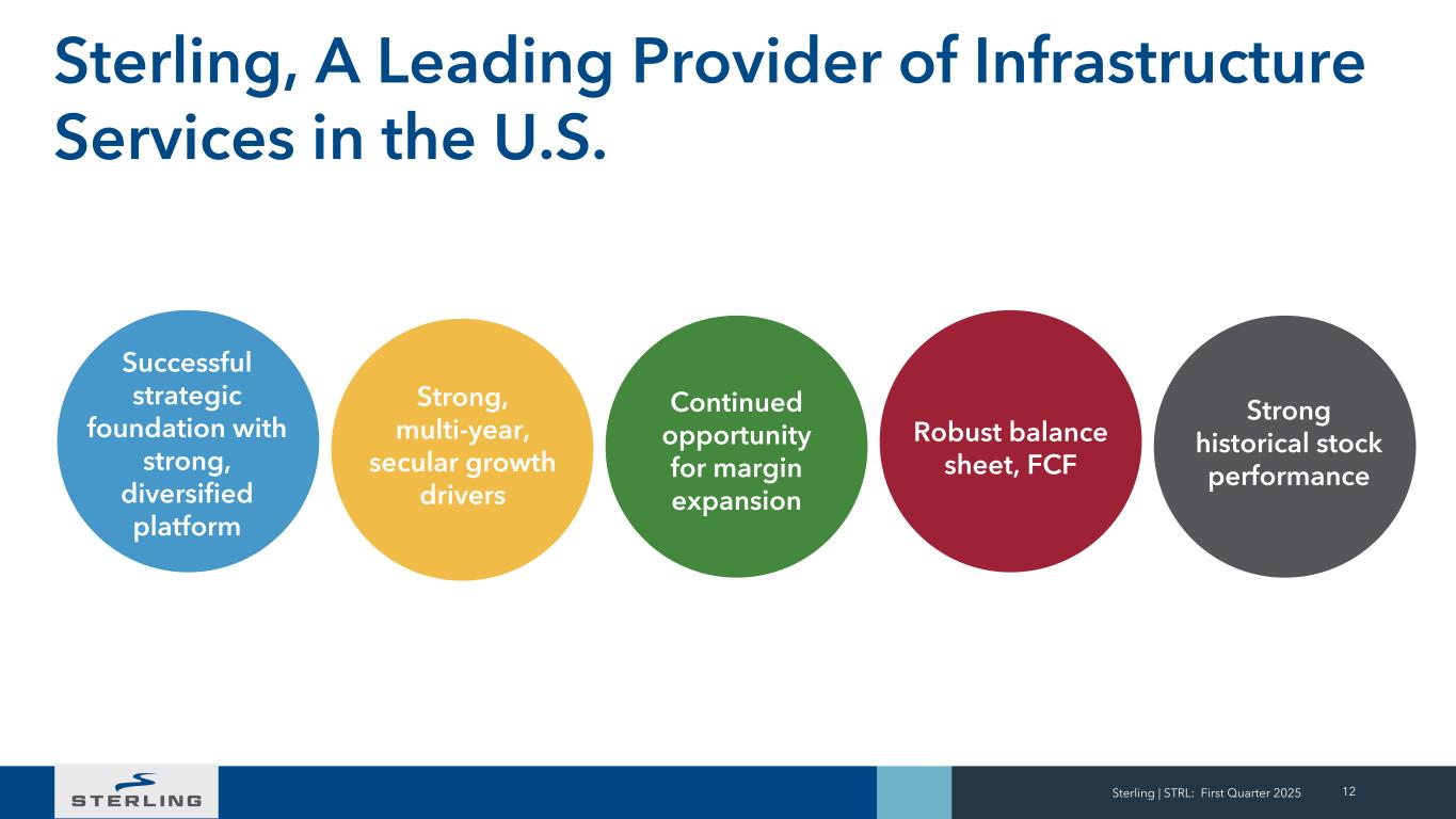 稳健的资产负债表丨FCF 12 Sterling,美国领先的基础设施服务提供商,战略基础成功,拥有强大的多元化平台,利润率扩张的持续机会强劲,多年、长期的增长驱动因素历史表现强劲Sterling | STRL:2025年第一季度