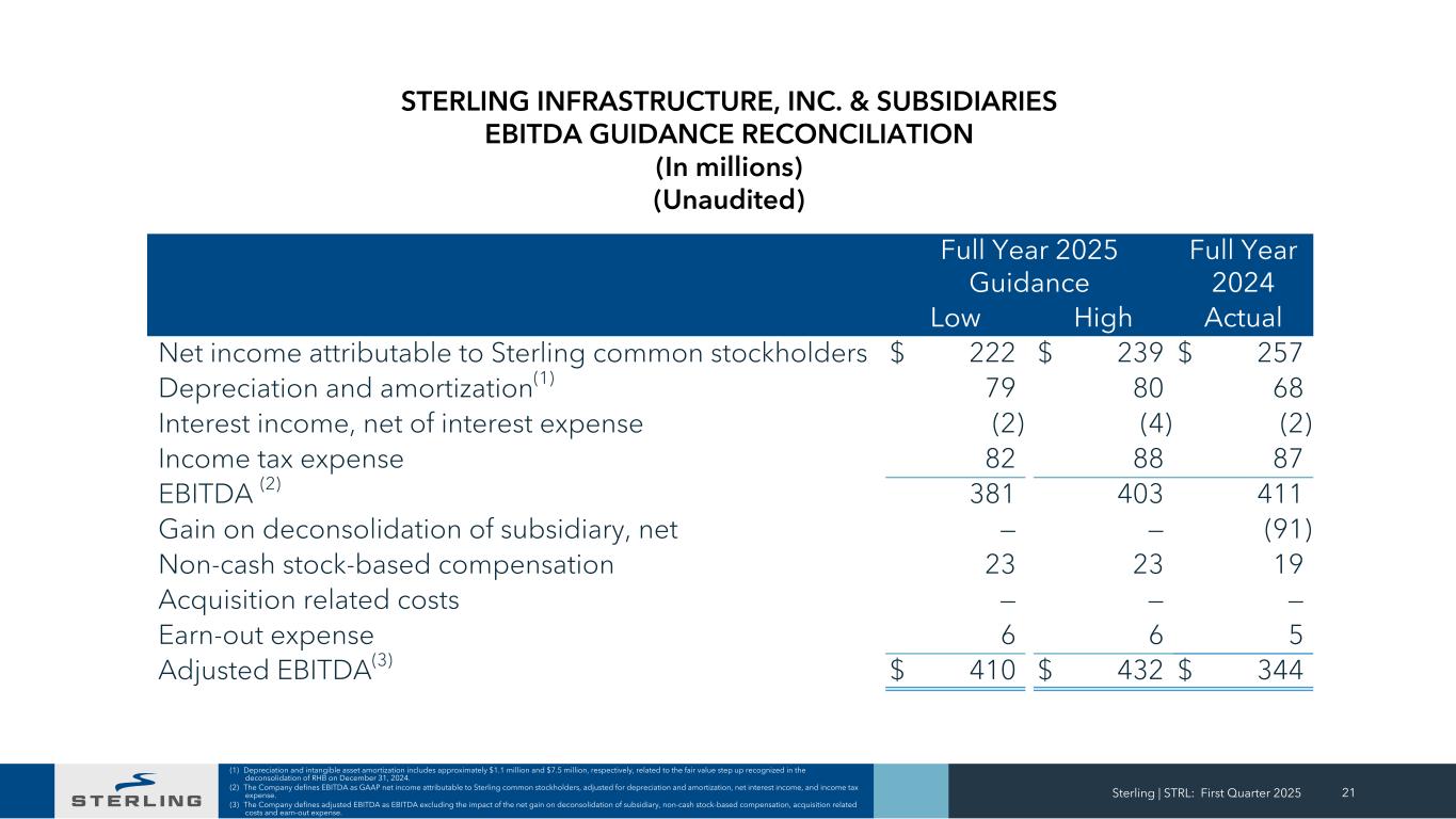 Sterling | STRL:2025年第一季度21(1)折旧和无形资产摊销分别包括约110万美元和750万美元,与2024年12月31日在RHB的分拆中确认的公允价值提升有关。(2)公司将EBITDA定义为GAAP归属于Sterling普通股股东的净利润,并根据折旧和摊销、净利息收入和所得税费用进行调整。(3)公司将调整后EBITDA定义为不包括分拆子公司的净收益、非现金股票薪酬、收购相关成本和盈利费用的影响的EBITDA。2025年全年指引2024年全年低高归属于英镑普通股股东的实际净利润222美元239美元257美元折旧和摊销(1)798068利息收入,扣除利息费用(2)(4)(2)所得税费用828887 EBITDA(2)381403411分拆子公司收益,净额——(91)非现金股票补偿232319收购相关成本————盈利费用665调整后EBITDA(3)410美元432美元344美元Sterling Infrastructure,INC. & Subsidiaries EBITDA指引对账(百万)(未经审计)