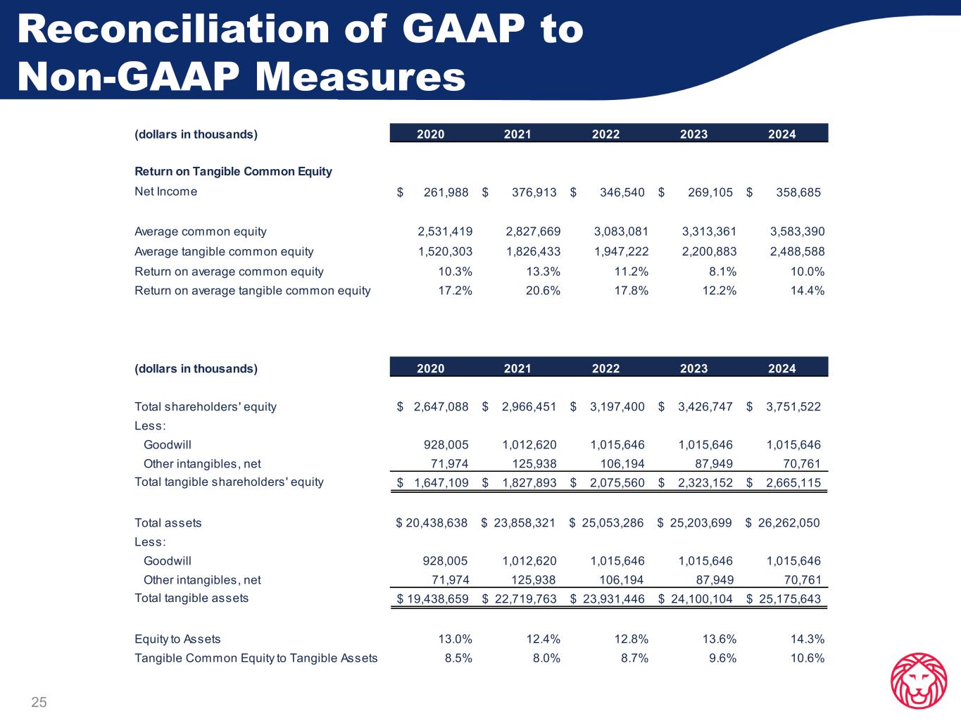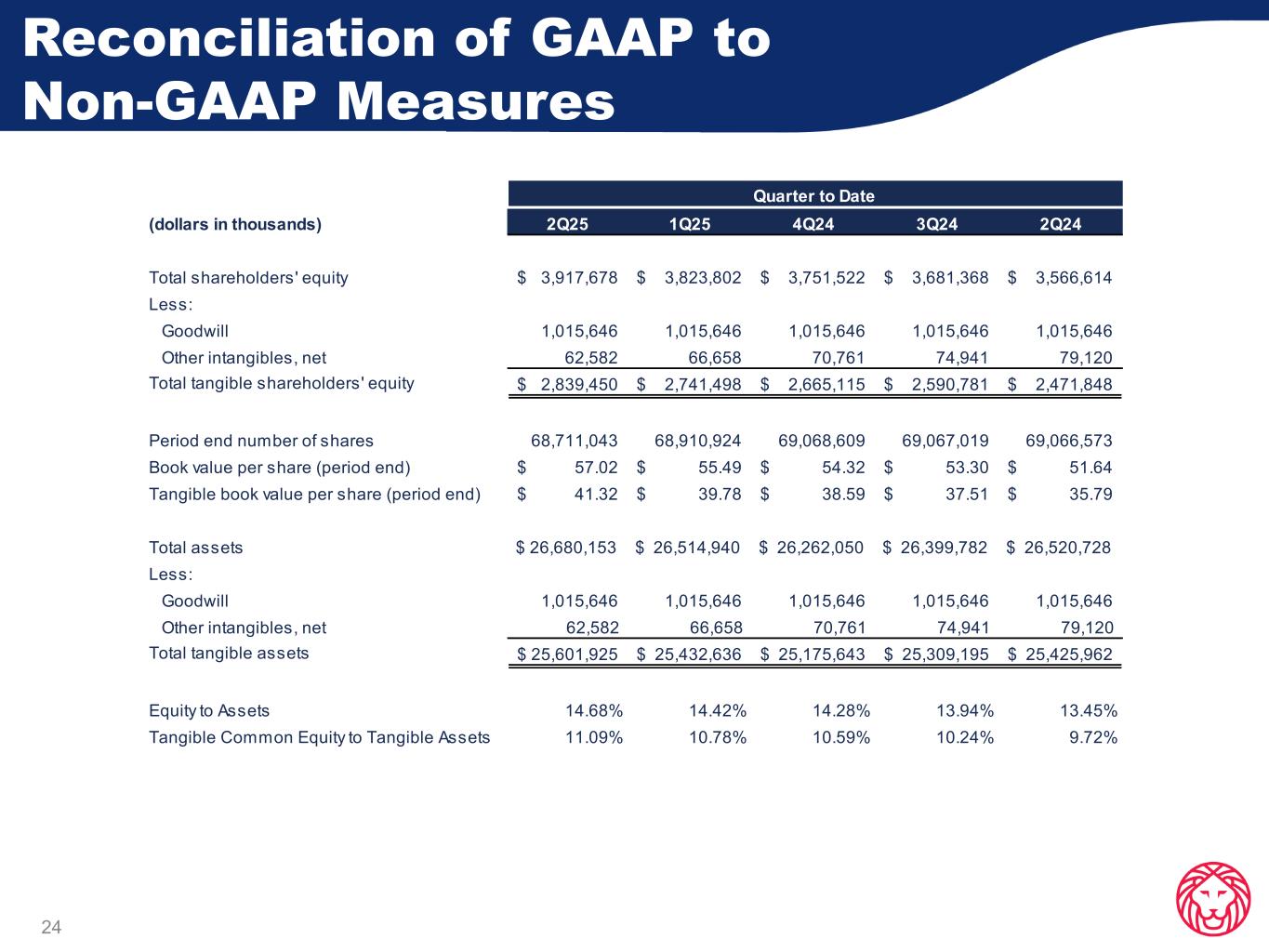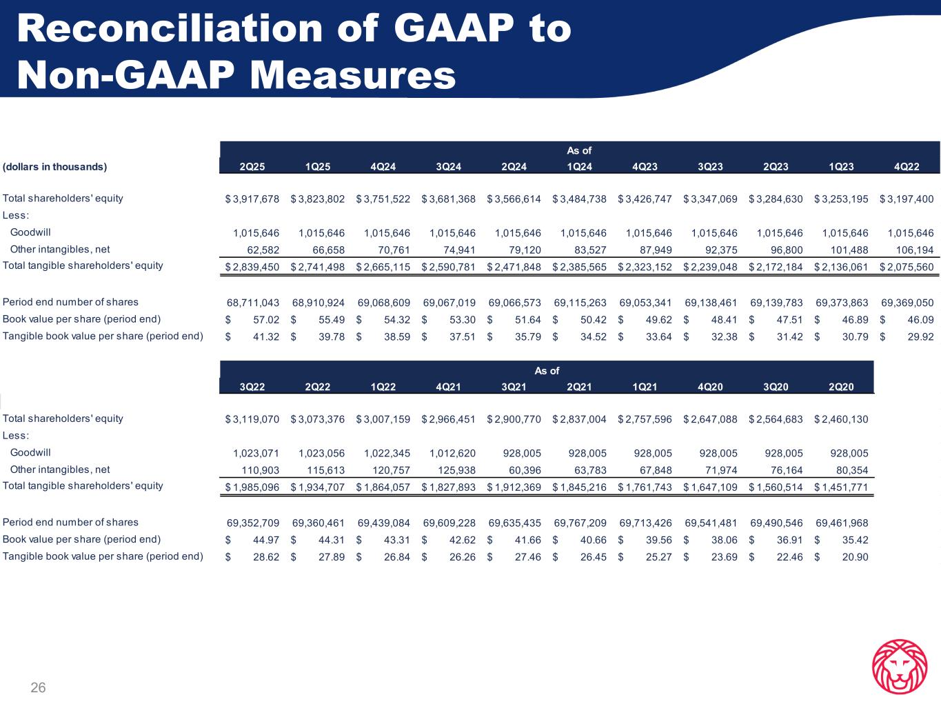 24 GAAP与非GAAP措施的调节(千美元)2Q25 1Q25 4Q24 3Q24 2Q24股东权益总额3,917,678美元3,823,802美元3,751,522美元3,681,368美元3,566,614美元减:商誉1,015,6461,015,6461,015,6461,015,6461,015,6461,015,646其他无形资产,净额62,58266,65870,76174,94179,120有形股东权益总额2,839,450美元2,741,498美元2,665,115美元2,590,781美元2,471,848美元期末股份数68,711,04368,910,92469,068,60969,067,01969,066,573每股账面价值(期末)57.02美元55.49美元54.32美元53.30美元51.64美元每股有形账面价值(期末)41.32美元39.78美元38.59美元37.51美元35.79美元总资产26,680,153美元26,514,940美元26,262,050美元26,399,782美元26,520,728减:商誉1,015,6461,015,646净额62,58266,65870,76174,94179,120有形资产总额25,601,925美元25,432,636美元25,175,643美元25,309,195美元25,425,962美元权益对资产14.68% 14.42% 14.28% 13.94% 13.45%有形普通权益对有形资产11.09% 10.78% 10.59% 10.24% 9.72%季度至今