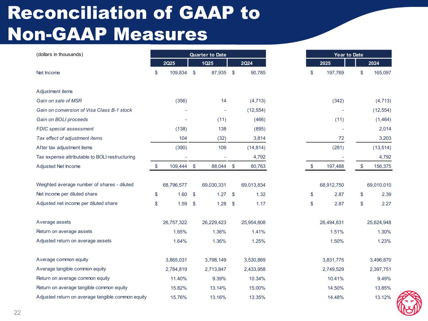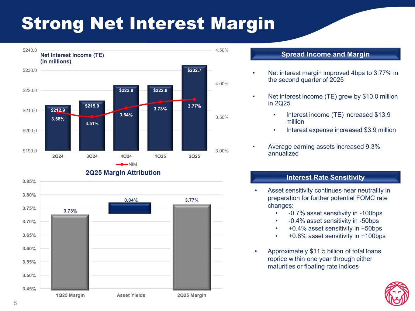 2025年第二季度财务亮点71 –考虑过的非GAAP衡量标准–见附录中GAAP与非GAAP衡量标准的对账(单位:千美元,每股数据除外)2Q25 1Q25变动2Q24变动20252024变动净收益$ 109,834 $ 87,93525% $ 90,78521% $ 197,769 $ 165,09720%调整后净收益(1)$ 109,444 $ 88,04424% $ 80,76336% $ 197,488 $ 156,37526%稀释后每股净收益$ 1.60 $ 1.2726% $ 1.3221% $ 2.87 $ 2.39 20%调整后每股净收益(1)$ 1.59 $ 1.2824% $ 1.17 36% $ 2.87 $ 2.2726%资产回报率1.65% 1.36% 21% 1.41% 17% 1.51% 1.30% 16%调整后资产回报率(1)1.64% 1.36% 21% 1.25% 31% 1.50% 1.23% 22%股本回报率11.40% 9.39% 21% 10.34% 10% 10.41% 9.49% 10% TCE回报率(1)15.82% 13.14% 20% 15.00% 5% 14.50% 13.85% 5%调整后TCE回报率(1)15.76% 13.16% 20% 13.35% 18% 14.48% 13.12% 10%效率比51.63% 52.83%-2 % 51.68% 0% 52.22% 53.54%-2 %调整后效率比(1)51.58% 52.62%-2 % 55.00%-6 % 52.09% 54.79%-5 %净息差3.77% 3.73% 1% 3.58% 5% 3.75% 3.54% 6%季度至今业绩年初至今业绩
