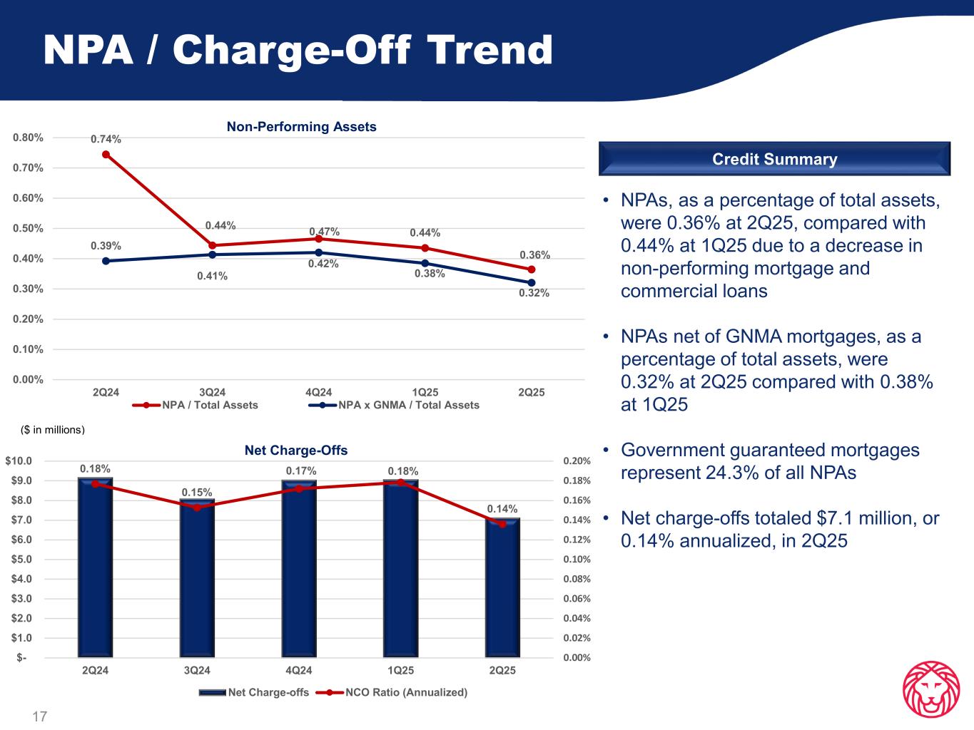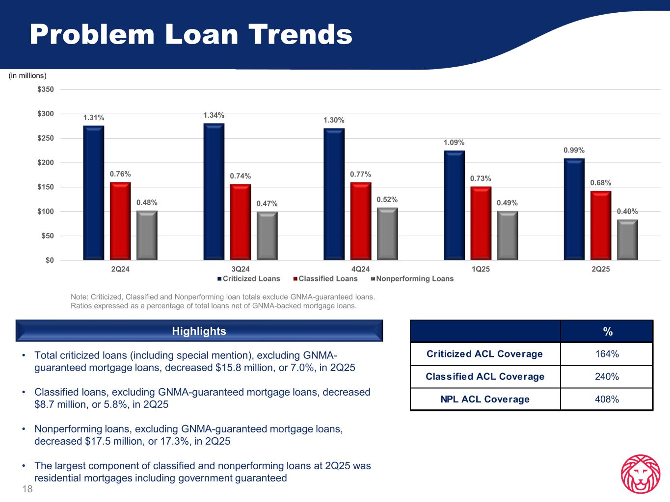 NPA/冲销趋势17 •由于不良抵押贷款和商业贷款减少,2Q25的不良资产占总资产的百分比为0.36%,而1Q25的百分比为0.44% • 2Q25扣除GNMA抵押贷款后的不良资产占总资产的百分比为0.32%,而1Q25为0.38% •政府担保抵押贷款占所有不良资产的24.3% •净冲销总额为710万美元,年化或0.14%,2Q25信用摘要(百万美元)0.74% 0.44% 0.47% 0.44% 0.36% 0.39% 0.41% 0.42% 0.38% 0.32% 0.000% 0.10% 0.20% 0.30% 0.40% 0.50% 0.60% 0.70% 0.80% 2Q24 3Q24 4Q24 1Q25 2Q25不良资产NPA/总资产NPA x GNMA/总资产0.18% 0.15% 0.17% 0.18% 0.14% 0.00 % 0.02% 0.04% 0.06% 0.08% 0.10% 0.12% 0.16% 0.18% 0.20% $-$ 1.0 $ 2.0 $ 3.0 $ 4.0 $ 5.0 $ 6.0 $ 7.0 $ 8.0 $ 9.0 $ 10.0 2Q24 3Q24 4Q24 1Q25 2Q25净冲销净冲销NCO比率(年化