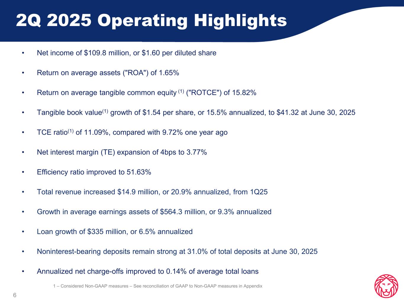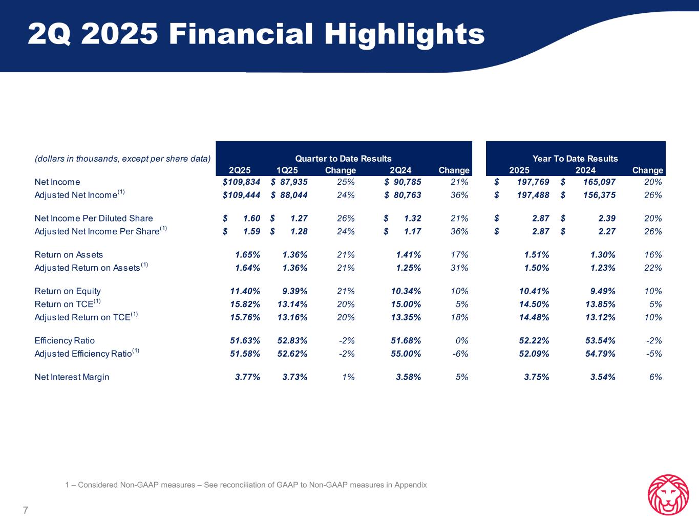 2025年第二季度经营亮点6•净收入1.098亿美元,或稀释后每股1.60美元•平均资产回报率(“ROA”)为1.65% •平均有形普通股权益回报率(1)(“ROTCE”)为15.82% •有形账面价值(1)增长每股1.54美元,或年化15.5%,至2025年6月30日为41.32美元• TCE比率(1)为11.09%,而一年前为9.72% •净息差(TE)扩大4bps至3.77% •效率比率提高至51.63% •总收入增加1490万美元,或年化20.9%,从2015年第一季度开始•平均收益资产增长5.643亿美元,年化9.3% •贷款增长3.35亿美元,年化6.5% •截至2025年6月30日,不计息存款占存款总额的31.0%保持强劲•年化净冲销占平均贷款总额的比例提高至0.14% 1 –考虑非公认会计原则衡量标准–见附录中的公认会计原则与非公认会计原则衡量标准的调节