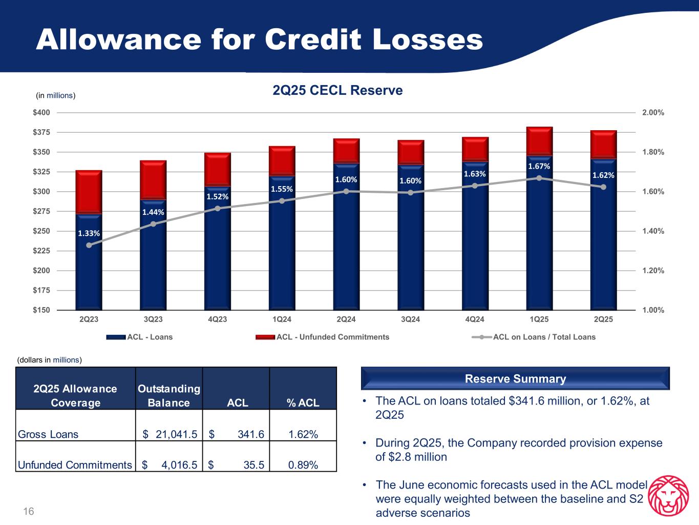 贷款余额变化2Q25贷款余额变化15 • 2Q25期间贷款余额增加3.35亿美元,年化6.5% • C & I的增加主要归因于抵押仓库额度和优质融资贷款的资金•建筑业下降是多户项目在2Q25转向定期融资的结果• 2Q25显示出自2022年以来的最高生产水平•较1Q25增长28.5% •较2Q24增长15.7%(以百万计)(1)C & I包括优质融资、抵押仓库、传统C & I、CSVLI,和设备融资$ 415 $ 271 $ 111 $ 13 $(42)$(76)$(357)$(400)$(300)$(200)$(100)$-$ 100 $ 200 $ 300 $ 400 $ 500 C & I(1)多户投资者CRE其他RE-RES OO CRE建设