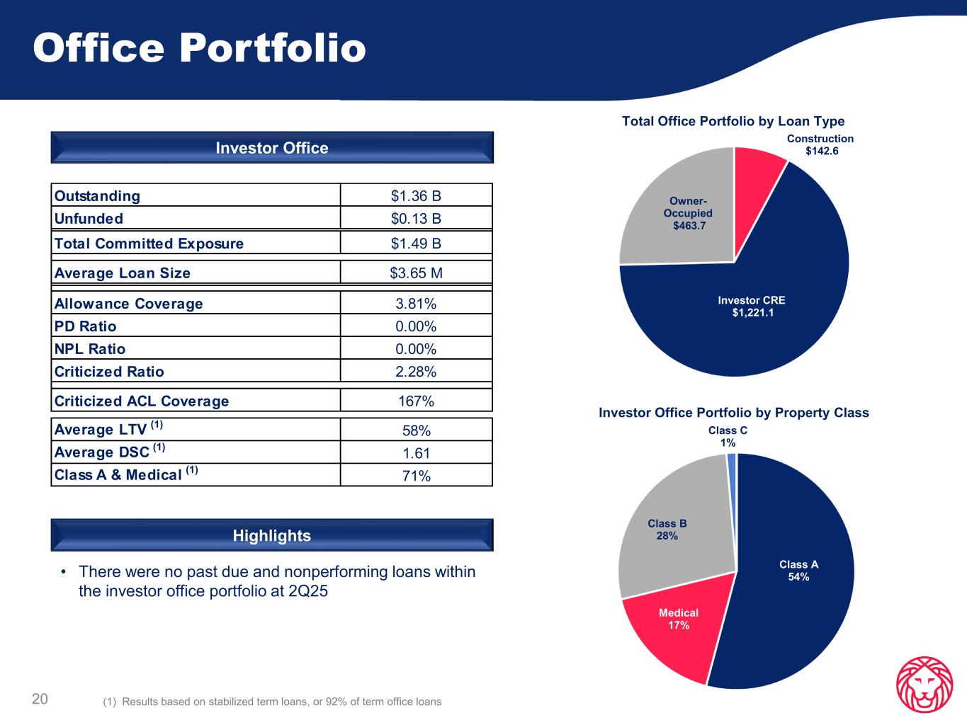 办公室投资组合• 2Q25投资者办公室投资组合中没有逾期和不良贷款20要点(1)基于稳定定期贷款的结果,或92%的定期办公室贷款投资者办公室建设142.6美元投资者CRE 1,221.1美元自住463.7美元按贷款类型划分的办公室总投资组合A类54%医疗17% B类28% C类1%按财产类别划分的投资者办公室投资组合未偿还1.36美元B无资金0.13美元B总承诺风险敞口1.49美元B平均贷款规模365万美元津贴覆盖率3.81% PD比率0.00 %不良贷款率0.00 %批评比率2.28%批评ACL覆盖率167%平均LTV(1)58%平均DSC(1)1.61 A类&医疗(1)71%