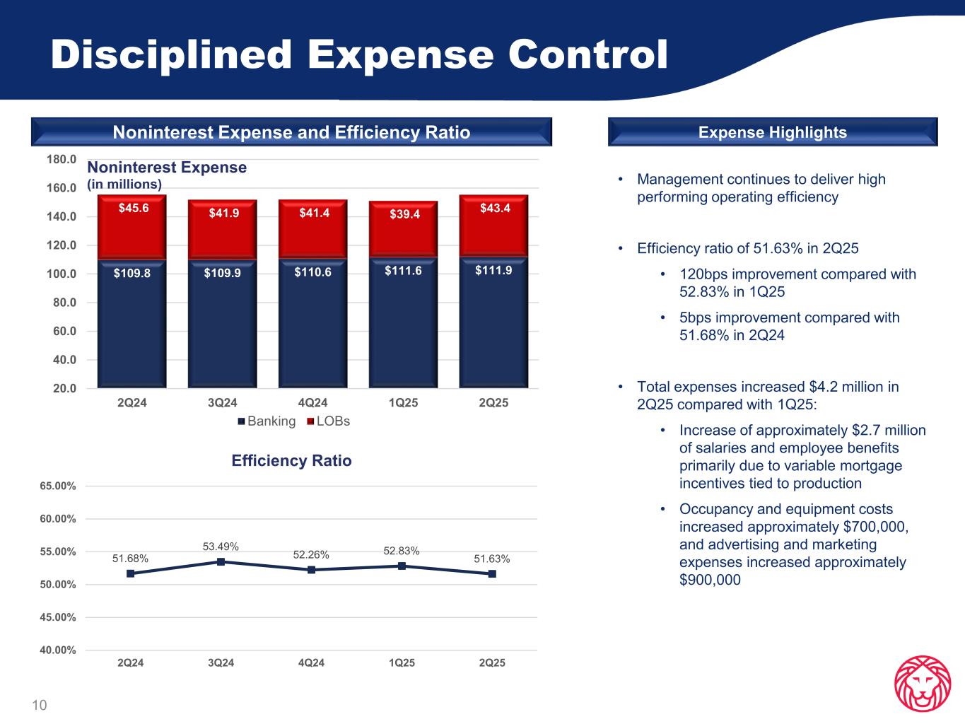 多元化收入流9 •核心银行部门和业务线的净利息收入的收入基础强劲•我们多元化业务线提供的额外收入抵押银行活动•抵押银行活动占2Q25总收入的13% •由于与建筑商的核心关系稳固,购买业务在2Q25占83%房地产经纪商•销售利润率收益从2025年第一季度的2.17%提高至2025年第二季度的2.22%其他非利息收入•其他非利息收入包括:•设备融资的费用收入• SBA贷款的销售收益• BOLI收入强劲的收入流2.45% 2.17% 2.40% 2.17% 2.22% 2.00% 2.10% 2.20% 2.30% 2.40% 2.50% 2Q24 3Q24 4Q24 1Q25 2Q25销售利润率抵押贷款收益71% 76% 76% 78% 77% 15% 13% 13% 12% 13% 14% 11% 11% 10% 10% $ 301.6 $ 284.7 $ 291.7 $ 286.8 $ 301.70% 20% 40% 60% 80% 100% 120% 2Q24 3Q24 4Q24 1Q25 2Q25收入来源(税收-EE25百万)净利息收入(TE)抵押银行活动其他非利息收入