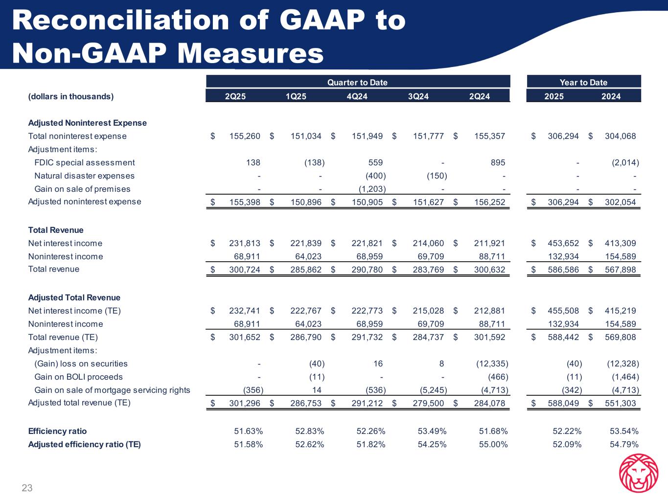 22 GAAP与非GAAP措施的对账(千美元)2Q25 1Q25 2Q24 20252024净收入109,834美元87,935美元90,785美元197,769美元165,097美元调整项目出售MSR收益(356)14(4,713)(342)(4,713)Visa B-1类股票转换收益--(12,554)-(12,554)BOLI收益收益-(11)(466)(11)(1,464)FDIC特别评估(138)138(895)-2,0 14调整项目的税收影响104(32)3,814723,203税后调整项目(390)109(14,814)(281)(13,514)BOLI重组应占税收费用--4,792-净收入109,444美元88,044美元80,763美元197,488美元156,375美元加权平均股数-稀释后68,796,57769,030,33169,013,83468,912,75069,010美元每股摊薄收益1.60美元1.27美元1.32美元2.87美元2.39美元调整后每股摊薄收益1.59美元1.28美元1.17美元2.87美元2.27美元平均资产26,757,32226,229,42325,954,80826,494,83125,624,948平均资产收益率1.65% 1.36% 1.41% 1.51% 1.30%调整后平均资产收益率1.64% 1.36% 1.25% 1.50% 1.23%平均普通股权益3,865,0313,798,1493,530,8693,831,7753,平均普通股权益11.40% 9.39% 10.34% 10.41% 9.49%平均有形普通股权益回报率15.82% 13.14% 15.00% 14.50% 13.85%调整后平均有形普通股权益回报率15.76% 13.16% 13.35% 14.48% 13.12%季度至今