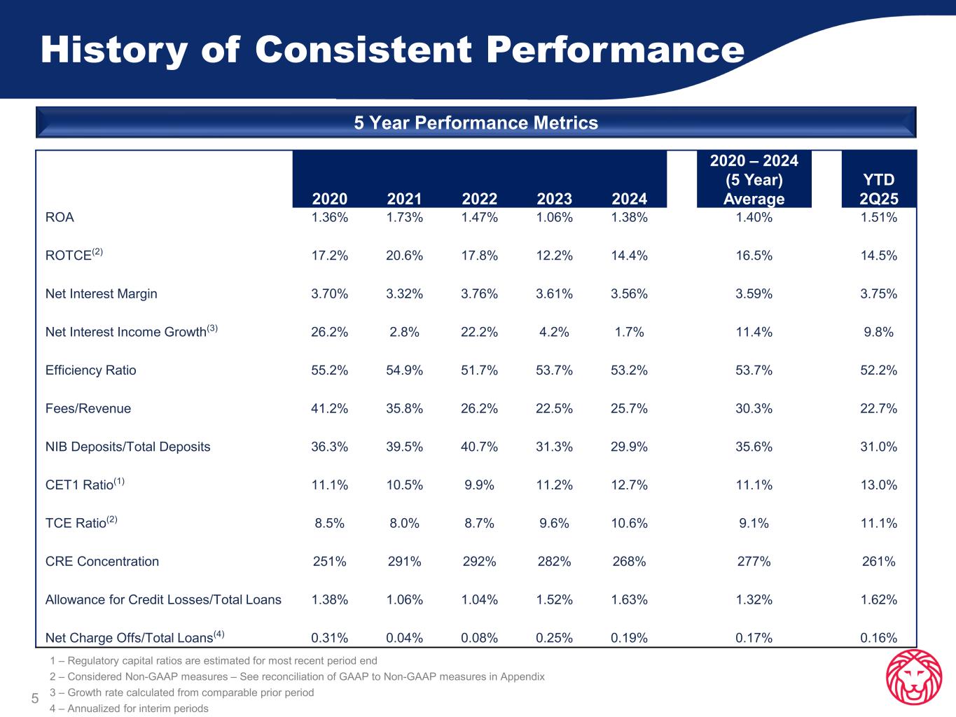 1 –监管资本比率是最近一个期末的估计数2 –考虑的非公认会计原则措施–见附录3中的公认会计原则与非公认会计原则措施的对账–从可比的上一期间计算的增长率4 –年化中期5历史一致业绩202020212022202320242020 – 2024(5年)年初至今2Q25 ROA1.36 % 1.73% 1.47% 1.06% 1.38% 1.40% 1.51% ROTCE(2)17.2% 20.6% 17.8% 12.2% 14.4% 16.5% 14.5%净息差3.70% 3.32% 3.76% 3.61% 3.56% 3.59% 3.75%净利息收入增长(3)26.2% 2.8% 22.2% 4.2% 1.7% 11.4% 9.8%效率比55.2% 54.9% 51.7% 53.2% 53.2% 52.2%费用/收入41.2% 35.8% 26.2% 22.5% 25.7% 30.3% 22.7% NIB存款/总存款36.3% 39.5% 40.7% 31.3%10.6% 9.1% 11.1% CRE集中度251% 291% 292% 282% 268% 277% 261%信用损失准备金/贷款总额1.38% 1.06% 1.04% 1.52% 1.63% 1.32% 1.62%净冲销/贷款总额(4)0.31% 0.04% 0.08% 0.08% 0.25% 0.19% 0.17% 0.16% 5年绩效指标