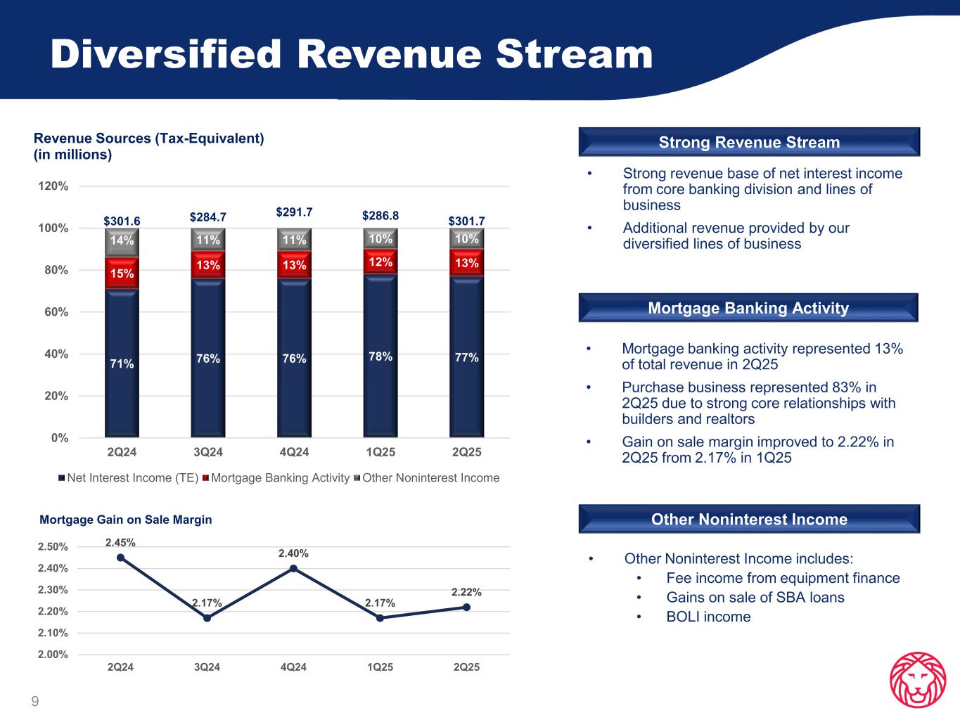 净息差强劲8 • 2025年第二季度净息差改善4bps至3.77% • 2Q25净利息收入(TE)增长1000万美元•利息收入(TE)增加1390万美元•利息支出增加390万美元•平均收益资产增加9.3%年化利差收入和边际利率敏感度•资产敏感度继续接近中性,为进一步潜在的FOMC利率变动做准备:•-0.7 %资产敏感度-100bps •-0.4 %资产敏感度-50bps • + 0.4%资产敏感度+ 50bps • + 0.8%资产敏感度+ 100bps •大约115亿美元的总贷款在一年内通过期限或浮动利率指数重新定价$ 212.9 $ 215.0 $ 222.8 $ 222.8 $ 232.7 3.58% 3.51% 3.64% 3.73% 3.77% 3.00% 3.50% 4.00% 4.50% $ 190.0 $ 200.0 $ 210.0 $ 220.0 $ 230.0 $ 240.0 2Q24 3Q24 4Q24 1Q25 2Q25净利息收入(TE)(百万)NIM