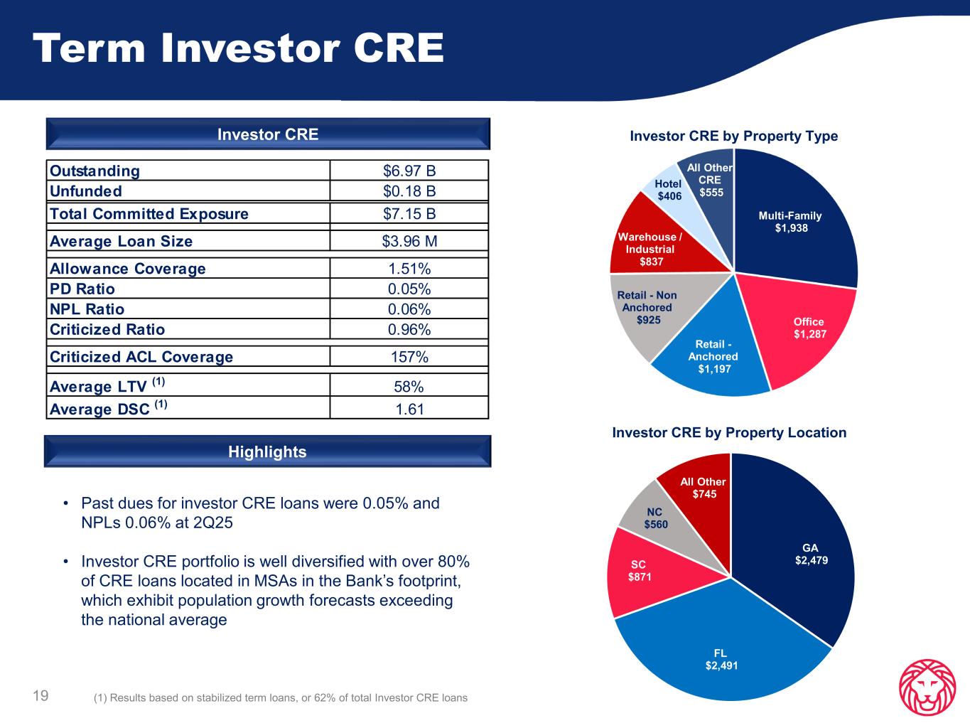 定期投资者CRE • 2Q25投资者CRE贷款的过往会费为0.05%,不良贷款为0.06% •投资者CRE投资组合非常多样化,超过80%的CRE贷款位于银行足迹中的MSA,其人口增长预测超过全国平均水平19亮点(1)基于稳定定期贷款的结果,或62%的投资者CRE贷款总额投资者CRE多户$ 1,938办公室$ 1,287零售-锚定$ 1,197零售-非锚定$ 925仓库/工业$ 837酒店$ 406所有其他CRE $ 555投资者CRE按物业类型GA $ 2,479 FL $ 2,491 SC $ 871 NC $ 560所有其他$ 745投资者CRE按物业位置未偿还$ 6.97 B无资金$ 0.18 B总承诺风险$ 7.15 B平均贷款规模$ 396万贷款覆盖率1.51% PD比率0.05%不良贷款率0.06%受批评比率0.96%受批评ACL覆盖率157%平均LTV(1)58%平均DSC(1)1.61