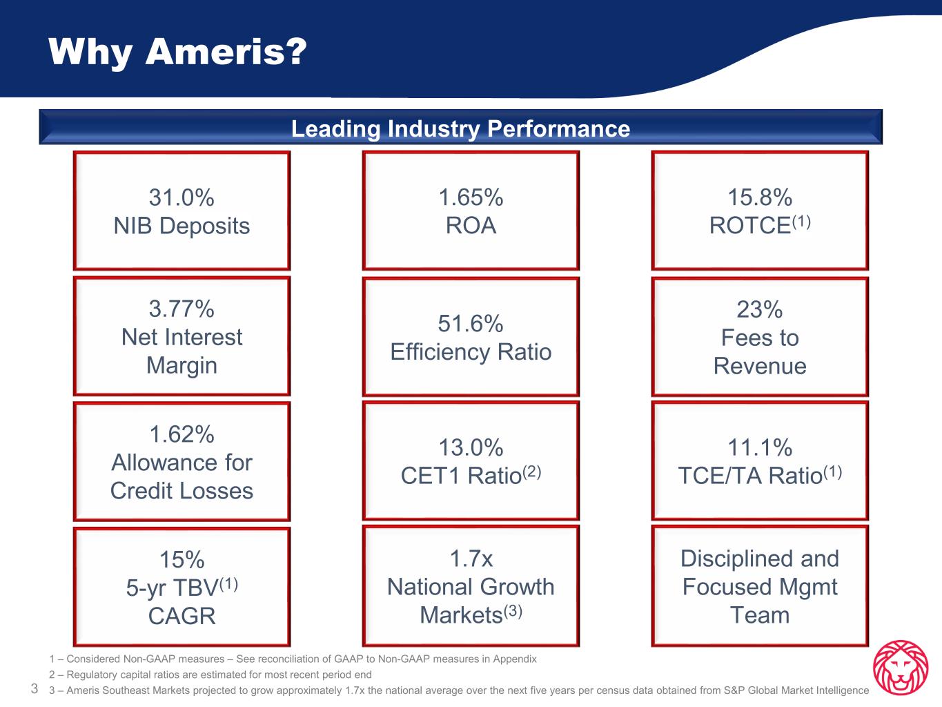 51.6%效率比率1.7x National Growth Markets(3)1.62%信贷损失准备金13.0% CET1比率(2)15% 5年TBV(1)CAGR15.8 % ROTCE(1)23%费用与收入有纪律和有重点的MGMT团队11.1% TCE/TA比率(1)31.0% NIB存款3.77%净息差1.65% ROA1 –考虑非公认会计原则措施–见附录2中公认会计原则与非公认会计原则措施的对账–监管资本比率是最近一个期末的估计3 – Ameris Southeast Markets根据从标普全球市场情报获得的人口普查数据,预计未来五年的全国平均增长率约为1.7倍3为什么是Ameris?行业业绩领先