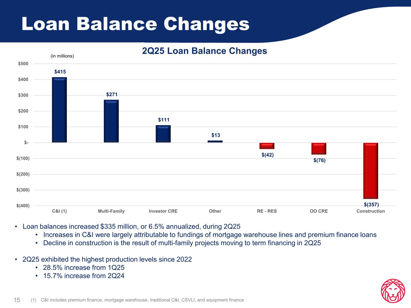 多样化的贷款组合2Q25贷款组合14 •贷款组合在贷款类型和地域之间非常多样化,由经验丰富的信贷人员管理•组合分布在超过155,000笔贷款中,平均规模约为13.5万美元•资产质量指标保持稳定,优于历史平均水平• CRE和建发集中度分别为261%和45%,而2Q25分别为261%和57% • 2Q25非自住办公室贷款总额为13.6亿美元,或占贷款总额的6.5% •贷款信用损失准备金(ACL)为贷款总额的1.62% •非抵押消费者贷款和HELOCs投资组合敞口有限凸显农业1% C & I 26%市政2%消费者1%投资者CRE 24% OO CRE 8%建筑7%多户家庭9% HELOC 2% SFR抵押贷款20% 210亿美元