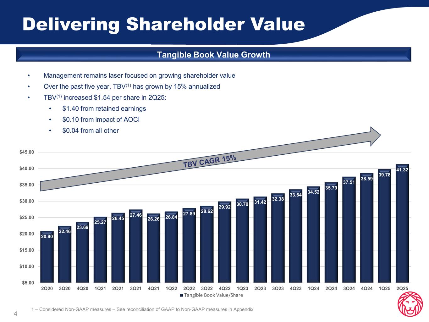 20.90 22.46 23.69 25.27 26.45 27.46 26.26 26.84 27.89 28.62 29.92 30.79 31.4232.3833.64 34.52 35.79 37.5 138.59 39.78 41.32 $ 5.00 $ 10.00 $ 15.00 $ 20.00 $ 25.00 $ 30.00 $ 35.00 $ 40.00 $ 45.00 2Q20 3Q20 1Q20 1Q21 2Q21 3Q21 4Q21 1Q22 2Q22 3Q22 4Q22 1Q23 3Q23 4Q23 1Q24 2Q24 4Q24 1Q25 2Q25有形账面价值/股份交付股东价值有形账面价值增长4 •管理层仍然专注于增加股东价值•过去五年,TBV(1)年化增长15% • TBV(1)2Q25每股增加1.54美元:• 1.40美元来自留存收益• 0.10美元来自AOCI的影响• 0.04美元来自所有其他1 –考虑非GAAP措施–见附录中GAAP与非GAAP措施的调节