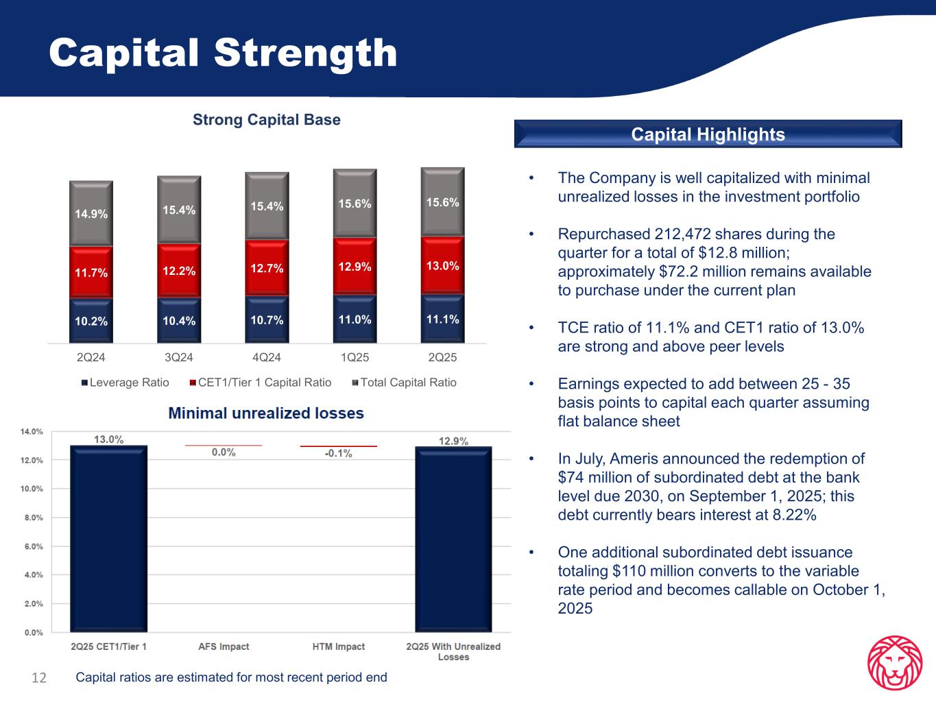 强劲的核心存款基础11按产品类型划分的存款存款类型余额(以000s计)占总计数的百分比平均每个账户NIB $ 6,800,51931.0% 311,427 $ 21,837 NOW 4,038,28418.4% 42,43595,164 MMDA 6,847,68631.2% 32,984207,606 Savings 760,0933.5% 63,62911,946 CD 3,486,09315.9% 38,96689,465总计$ 21,932,675100% 489,441 $ 44,812 •存款总额在2Q25期间增加了2030万美元,或年化0.4%:•公共资金的季节性流出总额为7710万美元•经纪CD增加了8180万美元,仅占存款总额的5% •剩余(非经纪,非公募基金)存款增加1560万美元•不计息存款保持强劲,占总存款的31.0%,高于2025年3月31日的30.8% 2Q25亮点消费35%商业45%公共15%经纪5% 2Q25客户存款