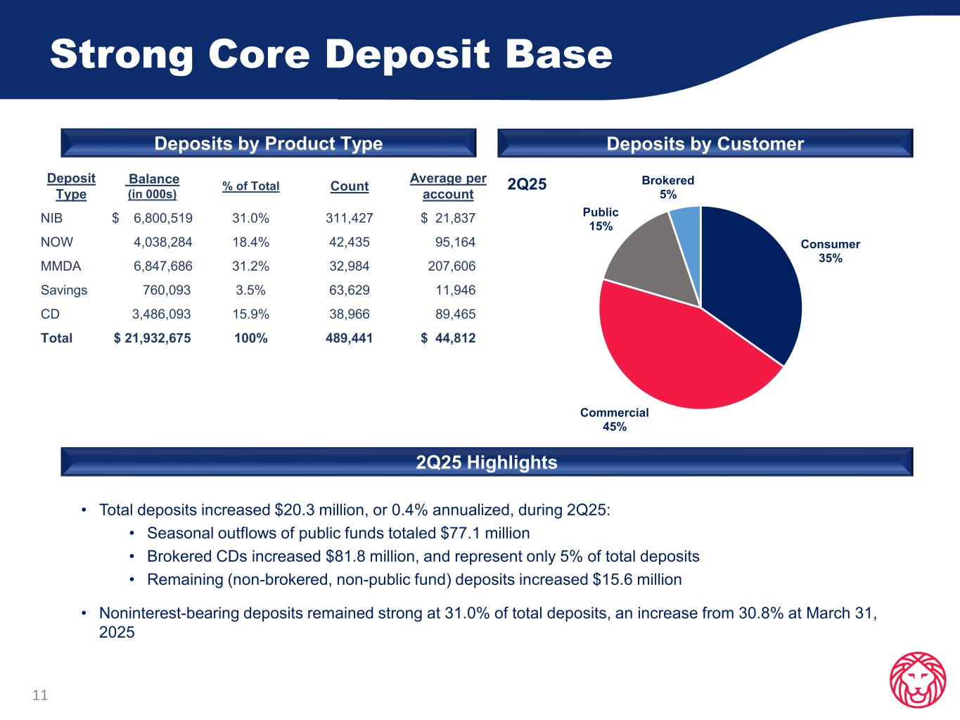 有纪律的费用控制非利息费用和效率比费用亮点10 •管理层继续提供高绩效的运营效率• 2Q25效率为51.63% •与1Q25的52.83%相比提高120个基点•与2Q24的51.68%相比提高5个基点•与1Q25相比,2Q25的总费用增加了420万美元:•工资和员工福利增加约270万美元,主要是由于与生产相关的可变抵押奖励•占用和设备成本增加约70万美元,广告和营销费用增加约900,000美元109.8美元109.9美元110.6美元111.6美元111.9美元45.6美元41.9美元41.4美元39.4美元43.42 0.04 0.06 0.08 0.0 100.01 20.01 40.01 60.01 80.0 2Q24 3Q24 4Q24 1Q25 2Q25非利息费用(百万)银行LOBs 51.68% 53.49% 52.26% 52.83% 51.63% 40.00% 45.00% 50.00% 55.00% 60.00% 65.00% 2Q24 3Q24 4Q24 1Q25 2Q25效率比