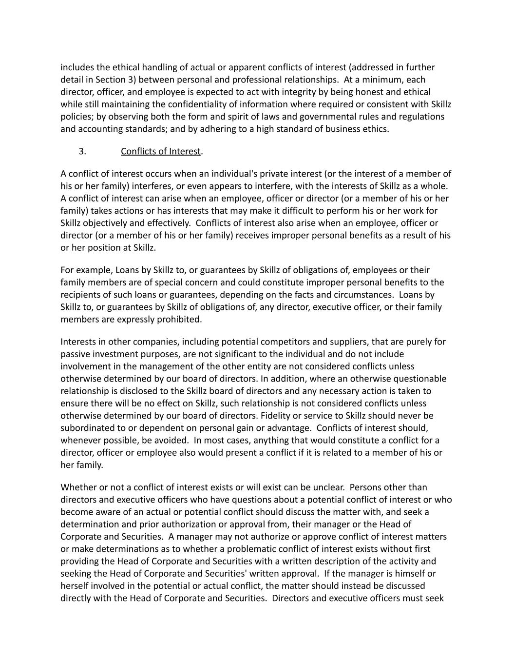 包括对个人和职业关系之间实际或明显的利益冲突(在第3节中进一步详细论述)的道德处理。至少,每一位董事、高级管理人员和员工都被期望以诚实和道德的方式行事,同时在需要或符合Skillz政策的情况下仍然保持信息的保密性;通过遵守法律和政府规章制度和会计准则的形式和精神;通过坚持高标准的商业道德。3.利益冲突。当个人的私人利益(或其家庭成员的利益)干扰,甚至似乎干扰了Skillz整体的利益时,就会发生利益冲突。当雇员、管理人员或董事(或其家庭成员)采取可能使Skillz难以客观有效地执行其工作的行动或存在利益时,可能会产生利益冲突。当雇员、管理人员或董事(或其家庭成员)因其在Skillz的职位而获得不正当的个人利益时,也会产生利益冲突。例如,Skillz向雇员或其家庭成员的贷款或Skillz对其义务的担保是特别令人关注的,可能构成对此类贷款或担保的接受者的不正当个人利益,具体取决于事实和情况。明确禁止Skillz向任何董事、执行官或其家庭成员提供贷款,或由Skillz为其义务提供担保。纯粹出于被动投资目的、对个人而言并不重要且不包括参与其他实体管理的其他公司的利益,包括潜在竞争对手和供应商的利益,除非我们的董事会另有决定,否则不被视为冲突。此外,如果向Skillz董事会披露了存在其他问题的关系,并且采取了任何必要的行动以确保不会对Skillz产生影响,则除非我们的董事会另有决定,否则此类关系不被视为冲突。对Skillz的忠诚或服务永远不应该服从或依赖于个人利益或优势。应尽可能避免利益冲突。在大多数情况下,任何对董事、高级职员或雇员构成冲突的事情,如果与其家庭成员有关,也会产生冲突。是否存在或将存在利益冲突可能不清楚。对潜在利益冲突有疑问或意识到实际或潜在冲突的董事和执行官以外的人员,应与其经理或公司和证券负责人讨论此事,并寻求其确定和事先授权或批准。经理人不得在未先向公司和证券负责人提供有关活动的书面描述并征求公司和证券负责人的书面批准的情况下,授权或批准利益冲突事项或确定是否存在有问题的利益冲突。如果经理本人参与了潜在或实际冲突,则应直接与企业和证券主管讨论此事。董事和执行官必须寻求