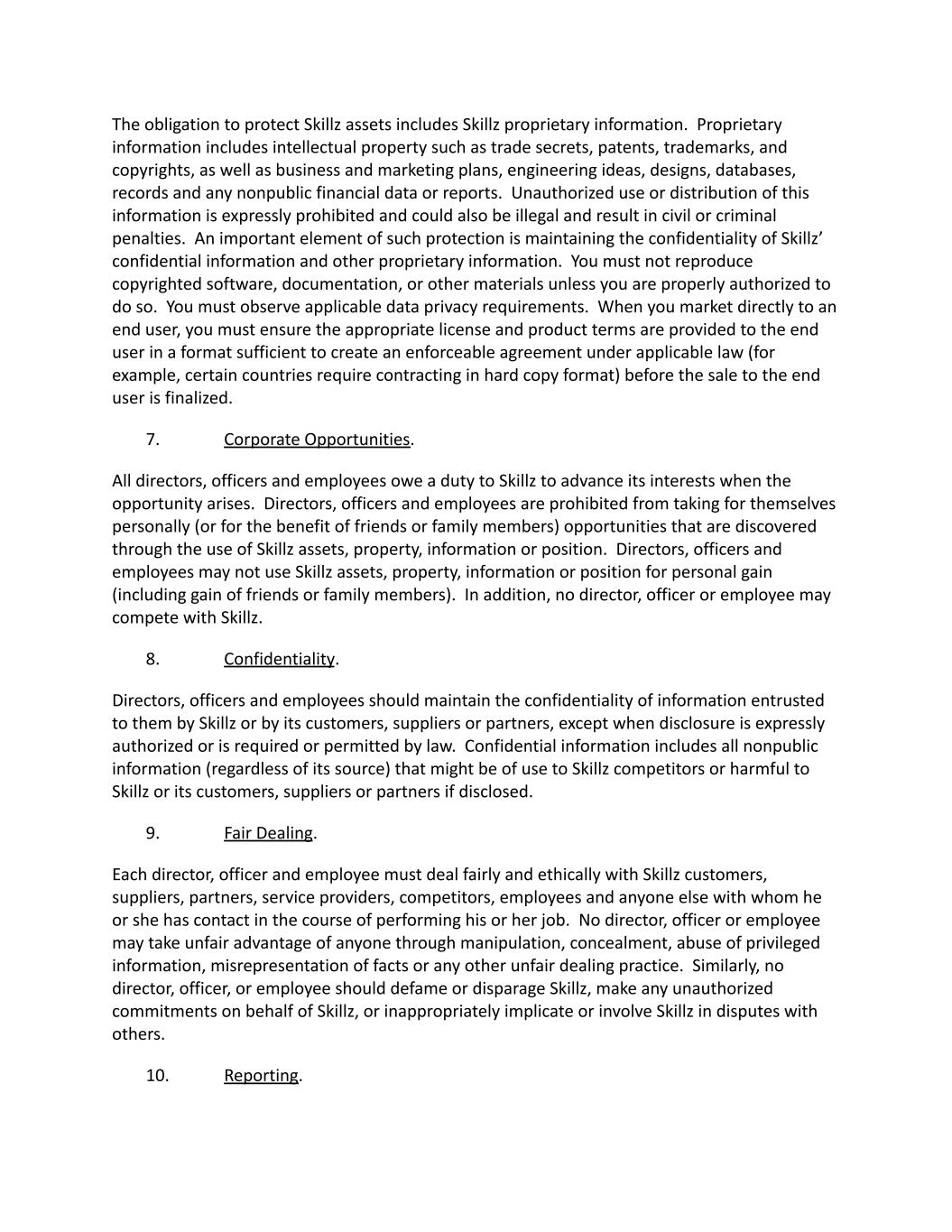 保护Skillz资产的义务包括Skillz专有信息。专有信息包括商业秘密、专利、商标、版权等知识产权,以及商业和营销计划、工程创意、设计、数据库、记录和任何非公开财务数据或报告。未经授权使用或传播这些信息是被明确禁止的,也可能是非法的,并导致民事或刑事处罚。此类保护的一个重要因素是维护Skillz机密信息和其他专有信息的机密性。除非获得适当授权,否则不得复制受版权保护的软件、文档或其他材料。您必须遵守适用的数据隐私要求。当您直接向最终用户进行营销时,您必须确保向最终用户提供适当的许可和产品条款,其格式足以根据适用法律创建可强制执行的协议(例如,某些国家要求以硬拷贝格式签订合同),然后才能最终完成向最终用户的销售。7.企业机会。所有董事、管理人员和员工都对Skillz负有责任,在机会出现时推进其利益。禁止董事、高级管理人员和雇员为个人(或为朋友或家人的利益)利用Skillz资产、财产、信息或职位发现的机会。董事、管理人员和员工不得利用Skillz资产、财产、信息或职位谋取私利(包括朋友或家人的利益)。此外,任何董事、高级职员或雇员不得与Skillz竞争。8.保密。董事、高级管理人员和员工应对Skillz或其客户、供应商或合作伙伴委托给他们的信息保密,除非有明确授权或法律要求或允许披露。机密信息包括所有可能对Skillz竞争对手有用或对Skillz或其客户、供应商或合作伙伴有害的非公开信息(无论其来源如何),如果披露的话。9.公平交易。每位董事、管理人员和员工必须公平和合乎道德地与Skillz客户、供应商、合作伙伴、服务提供商、竞争对手、员工以及他或她在履行工作过程中接触的任何其他人打交道。任何董事、高级管理人员或雇员不得通过操纵、隐瞒、滥用特权信息、歪曲事实或任何其他不公平交易行为对任何人进行不公平的利用。同样,任何董事、管理人员或员工都不应诋毁或贬低Skillz,代表Skillz做出任何未经授权的承诺,或在与他人的纠纷中不适当地牵连或涉及Skillz。10.报告。
