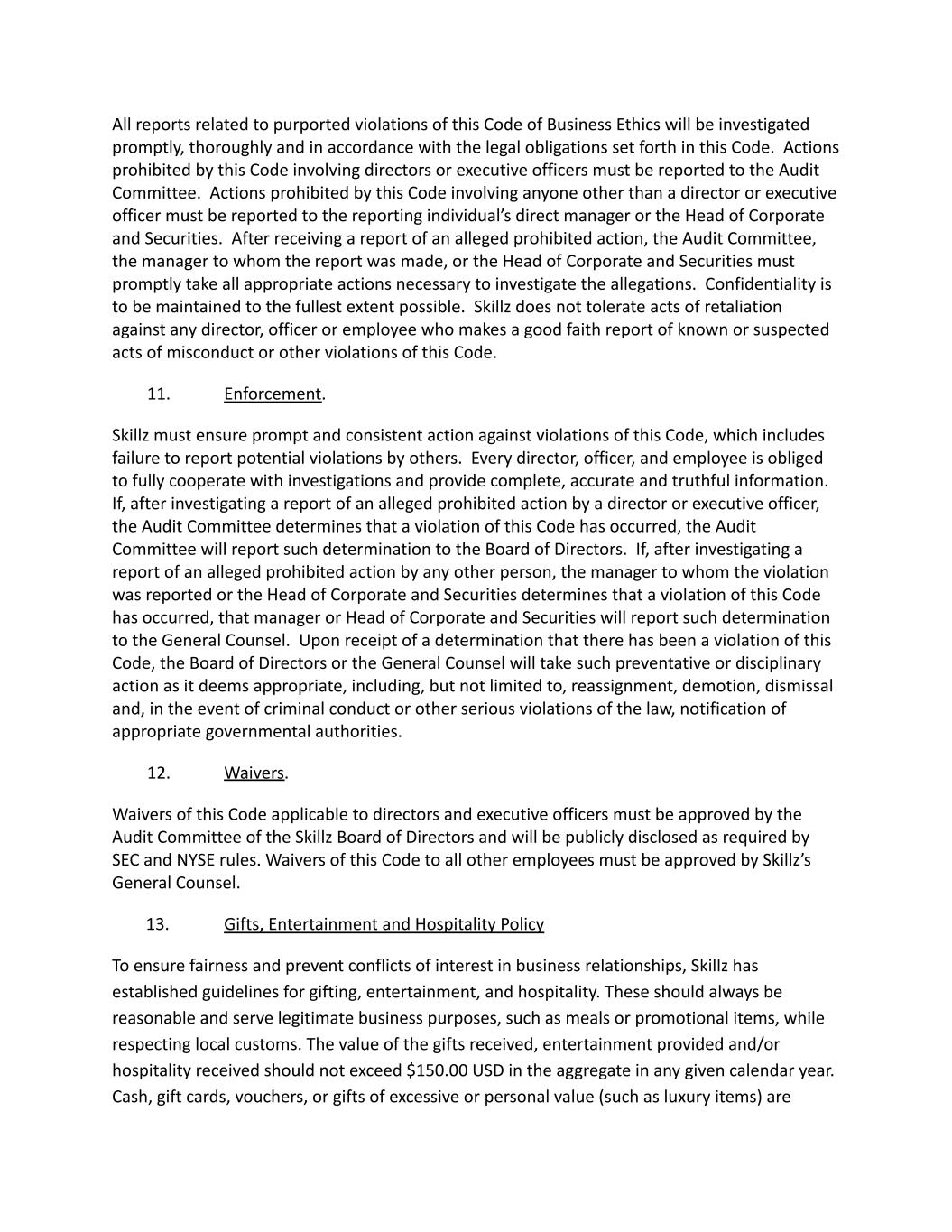 所有与声称违反本商业道德准则有关的举报,将根据本准则规定的法律义务进行及时、彻底和彻底的调查。本守则禁止的涉及董事或执行官的行动必须向审计委员会报告。本守则禁止的涉及董事或执行官以外的任何人的行动,必须向报告个人的直接经理或公司和证券负责人报告。在收到关于涉嫌禁止行动的报告后,审计委员会、向其提出报告的经理或公司和证券主管必须迅速采取所有必要的适当行动,以调查这些指控。要尽可能保持保密。Skillz不会容忍针对任何董事、高级职员或员工就已知或涉嫌的不当行为或其他违反本准则的行为进行善意报告的报复行为。11.强制执行。Skillz必须确保针对违反本准则的行为采取及时和一致的行动,其中包括未报告他人的潜在违规行为。每一位董事、管理人员、员工都有义务充分配合调查,提供完整、准确、真实的信息。如果审计委员会在调查有关董事或执行官涉嫌禁止行动的报告后,确定发生了违反本准则的行为,审计委员会将向董事会报告该确定。如果在对任何其他人的涉嫌禁止行为的报告进行调查后,向其报告违规行为的经理或公司和证券负责人确定发生了违反本准则的行为,则该经理或公司和证券负责人将向总法律顾问报告此种确定。董事会或总法律顾问在收到违反本准则的认定后,将采取其认为适当的预防或纪律行动,包括但不限于调任、降级、撤职,并在发生犯罪行为或其他严重违法行为时通知适当的政府当局。12.豁免。适用于董事和执行官的本守则豁免必须获得Skillz董事会审计委员会的批准,并将按照SEC和NYSE规则的要求公开披露。对所有其他员工的本守则豁免必须得到Skillz总法律顾问的批准。13.礼品、娱乐和款待政策为确保公平并防止商业关系中的利益冲突,Skillz制定了礼品、娱乐和款待准则。这些应该永远是合理的,服务于合法的商业目的,例如膳食或促销品,同时尊重当地习俗。收到的礼物、提供的娱乐和/或收到的款待的价值在任何给定日历年的总额不应超过150.00美元。现金、礼品卡、代金券或价值过高或个人价值的礼物(如奢侈品)是