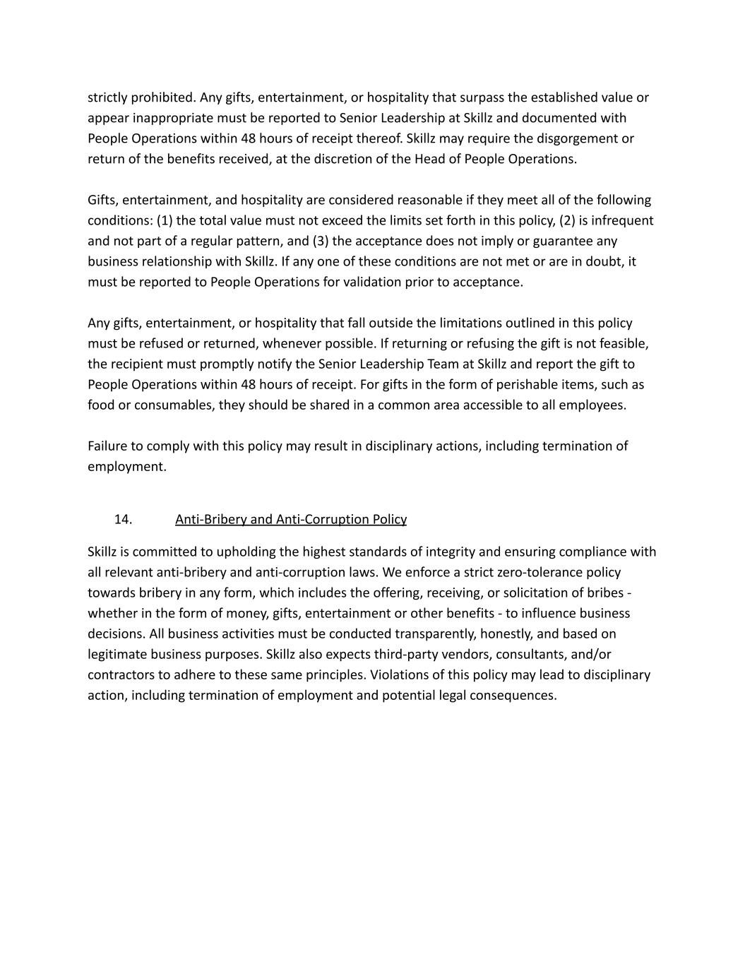 严禁。任何超出既定价值或显得不合适的礼物、娱乐或款待,必须在收到后48小时内报告给Skillz的高级领导,并与人员运营部门记录在案。Skillz可能会要求退还或返还收到的福利,由人事运营主管酌情决定。礼品、娱乐和款待如果满足以下所有条件,则被认为是合理的:(1)总价值不得超过本政策规定的限制,(2)不频繁且不属于常规模式,以及(3)接受并不意味着或保证与Skillz有任何业务关系。如果这些条件中的任何一项不满足或存在疑问,则必须在验收前报告给People Operations进行验证。任何超出本政策规定的限制范围的礼品、娱乐或款待必须拒绝或退回,只要有可能。如果退货或拒收礼物不可行,收礼者必须及时通知Skillz高级领导团队,并在收到礼物后48小时内将礼物报告给People Operations。对于食品、消耗品等易腐物品形式的礼品,应在全员无障碍的公共区域共享。不遵守这一政策可能会导致纪律处分,包括终止雇用。14.反贿赂和反腐败政策Skillz致力于维护最高的廉洁标准,并确保遵守所有相关的反贿赂和反腐败法律。我们对任何形式的贿赂都执行严格的零容忍政策,其中包括提供、接受或索取贿赂——无论是以金钱、礼物、娱乐或其他利益的形式——来影响商业决策。一切经营活动都要透明、诚实、以正当经营目的为基础进行。Skillz还希望第三方供应商、顾问和/或承包商遵守这些相同的原则。违反这一政策可能会导致纪律处分,包括终止雇佣和潜在的法律后果。