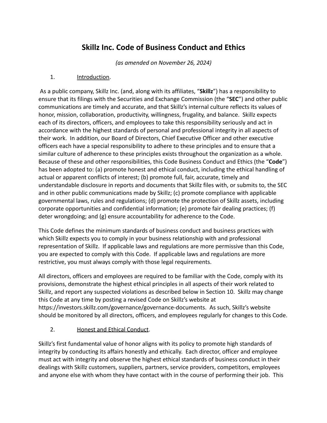 Skillz Inc.商业行为和道德准则(2024年11月26日修订)1。简介。作为一家上市公司,Skillz Inc.(以及与其关联公司一起称为“Skillz”)有责任确保其向美国证券交易委员会(“SEC”)提交的文件和其他公共传播信息是及时和准确的,并且Skillz的内部文化反映了其荣誉、使命、协作、生产力、意愿、节俭和平衡的价值观。Skillz希望公司的每一位董事、管理人员和员工认真对待这一责任,并在其工作的各个方面按照个人和职业诚信的最高标准行事。此外,我们的董事会、首席执行官和其他执行官各自负有遵守这些原则的特殊责任,并确保在整个组织中存在类似的遵守这些原则的文化。由于这些责任和其他责任,本《商业行为和道德准则》(“《准则》”)的采用旨在:(a)促进诚实和道德行为,包括以道德方式处理实际或明显的利益冲突;(b)促进Skillz向SEC提交或提交的报告和文件以及Skillz进行的其他公开沟通中的充分、公平、准确、及时和可理解的披露;(c)促进遵守适用的政府法律、规则和条例;(d)促进对Skillz资产的保护,包括企业机会和机密信息;(e)促进公平交易做法;(f)阻止不法行为;(g)确保遵守《守则》的责任。本准则定义了Skillz希望您在与Skillz的业务关系和专业代表方面遵守的业务行为和业务实践的最低标准。如果适用的法律法规比本准则更宽松,则应遵守本准则。如果适用的法律法规限制性更强,你必须始终遵守那些法律要求。所有董事、管理人员和员工都必须熟悉《守则》,遵守其规定,在与Skillz相关的工作的各个方面表现出最高的道德原则,并报告下文第10节中所述的任何涉嫌违规行为。Skillz可以随时通过在Skillz的网站上发布修订后的代码来更改此代码,网址为https://investors.skillz.com/governance/governance-documents。因此,Skillz的网站应该受到所有董事、管理人员和员工的定期监控,以了解本准则的变化。2.诚实和道德操守。Skillz的第一个基本荣誉价值与其通过诚实和合乎道德地处理事务来促进高标准诚信的政策是一致的。每位董事、管理人员和员工在与Skillz客户、供应商、合作伙伴、服务提供商、竞争对手、员工以及他们在履行工作过程中接触的任何其他人打交道时,都必须诚信行事,遵守最高的商业行为道德标准。这个
